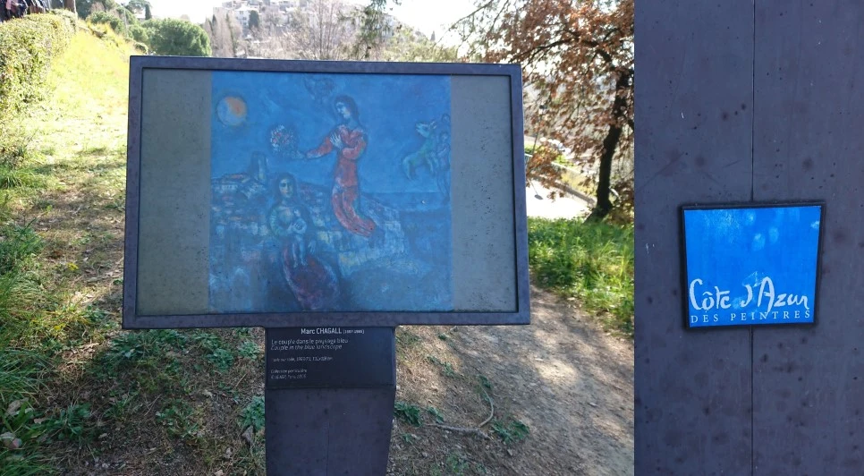 인상주의 화가 마크(마르크) 샤갈(1887~1985)이 그린 '파란 풍경 속 부부'(Le couple dans le paysage bleu) 작품이 마을 어귀에서 우릴 맞는다. 20세기 최고 화가 중 한 사람으로 불리는 샤갈은 러시아 제국에서 태어난 프랑스 화가다.