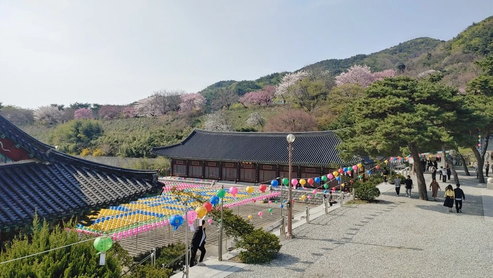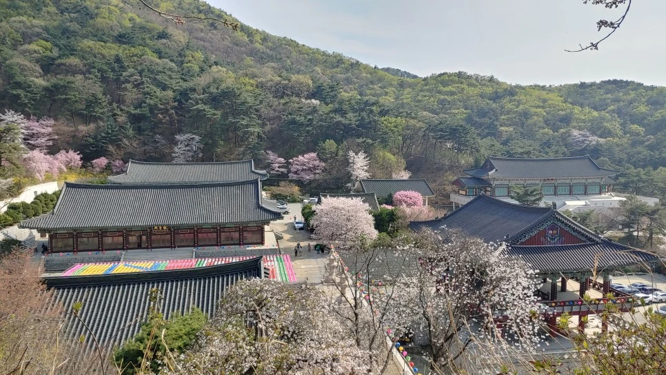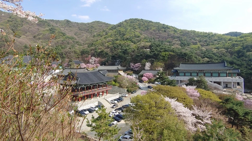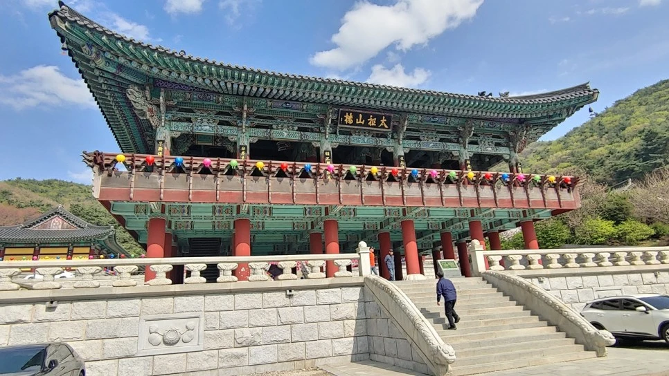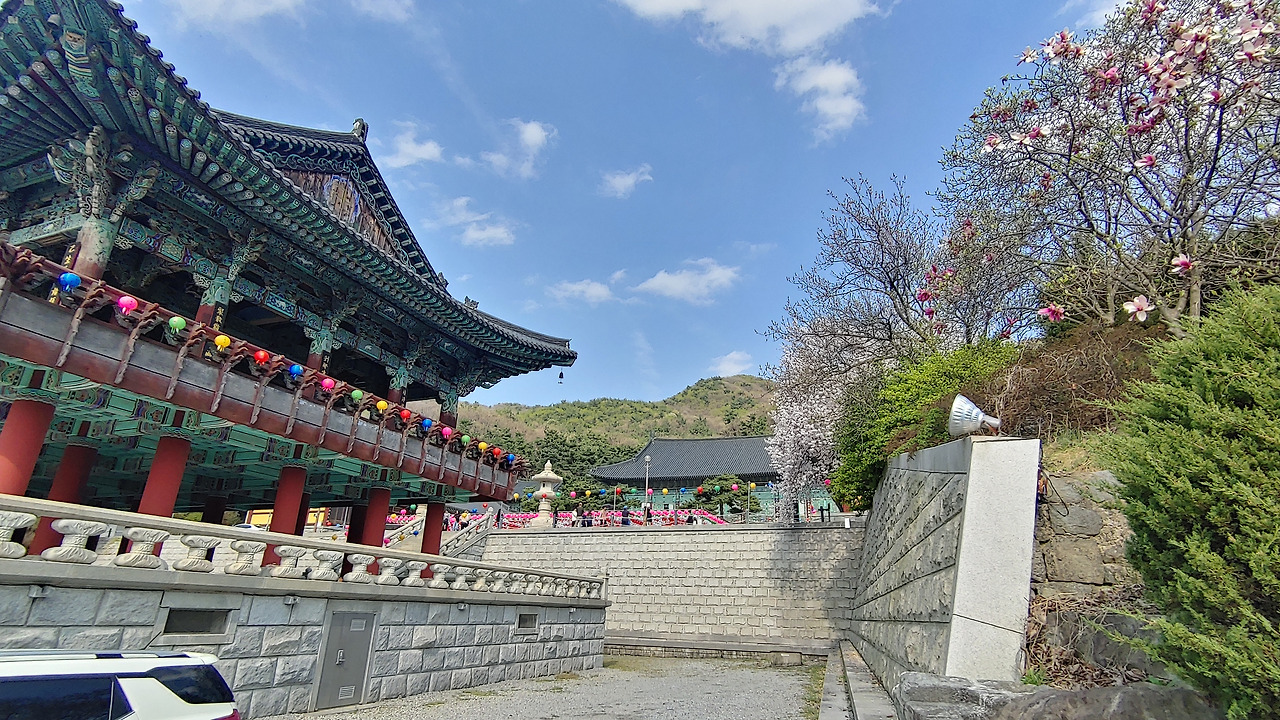 태조산루에서 오른쪽 언덕길을 따라 올라가면, 잠시 황홀할 정도로 아름다운 겹벚꽃 자태 푹 빠져버리게 된다. '나한전'을 지나쳐 '대웅보전'으로 오르는 길 따라 화창한 4월 봄 풍경이 계속 이어졌다.
