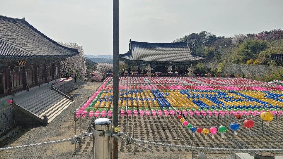 대웅보전 앞에서 바라본 풍경 - 왼쪽 관음전, 앞쪽 태조산루 '성종각', 오른쪽으로 경해원 지붕이 조금 보인다. 관음전 앞뜰 가득 들어선 연등 행렬은 곧 다가올 5월 15일(음 4월 8일)'부처님 오신 날'을 미리 경축하고 있는 듯 보였다.