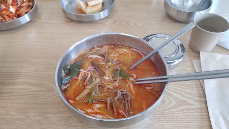 천호지 가까이 있는 '지금 육개장' 집으로 가서 '육개장 칼국수+국수+밥' (1만 원/ 1인)을 먹었다.