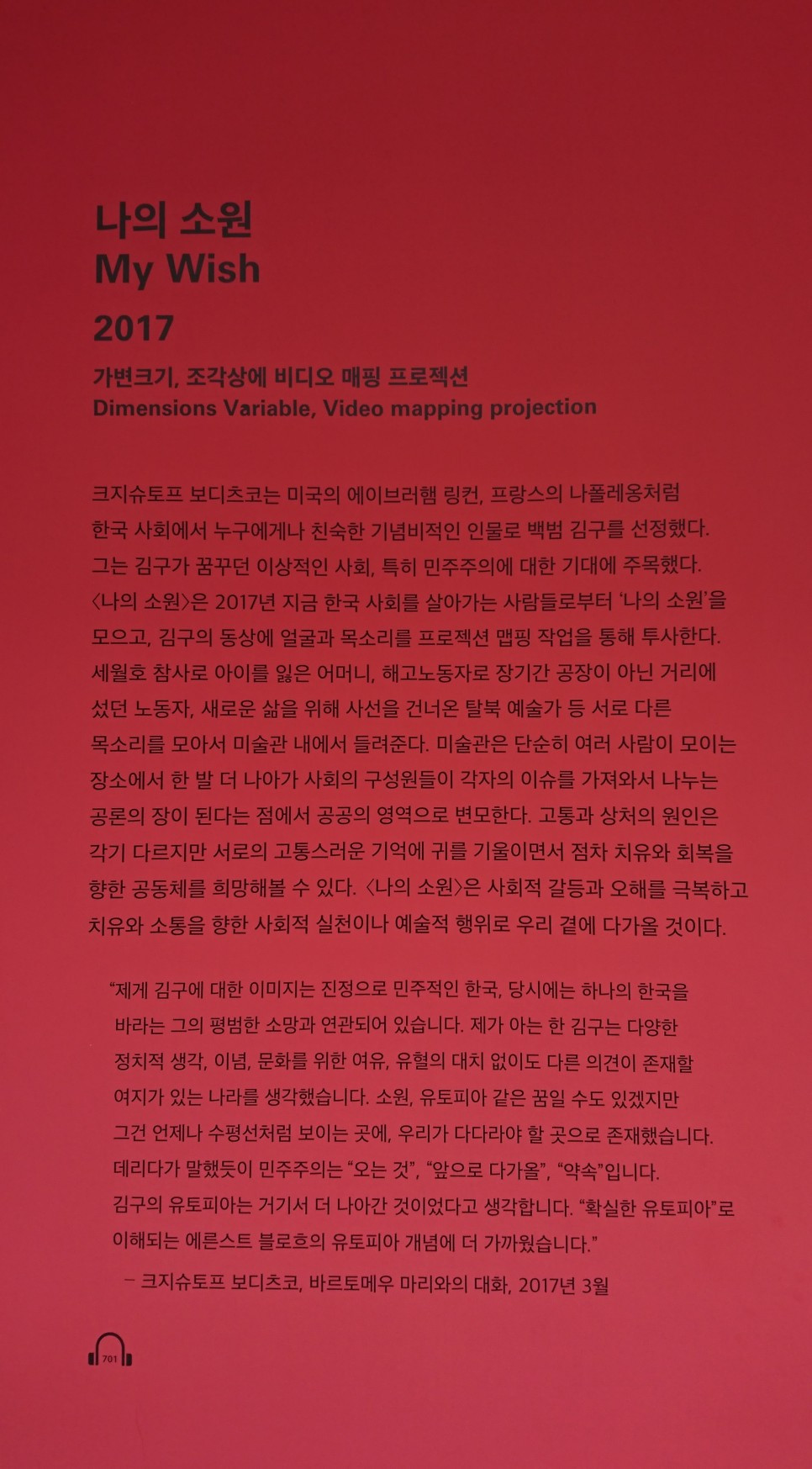 2017년 10월, 크지슈토프 보디츠코의 기구, 기념비, 프로젝트 국립현대미술관 제7전시실에서도 세월호 참사가 언급된다. 김구 선생의 동상에 2017년 한국인 얼굴과 목소리를 프로젝션 매핑 작업으로 투사한 <나의 소원>이란 작품이다.