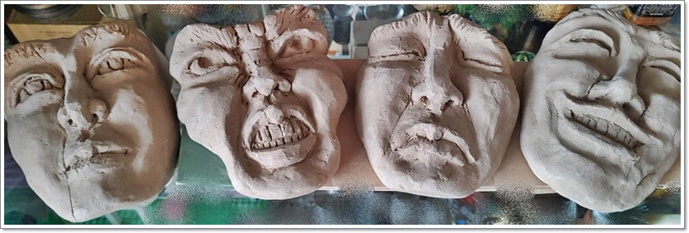 지난 4월 9일, 우쿨렐레 야외수업 때 사용하기 위한 보면대 찾기는 이렇게 끝났지만, 지금 30대인 아들이 고교 시절 빚어 두었던 '희로애락'이 담긴 4개의 얼굴을 찾아내서 기뻤다. 잔잔한 미소가 번지던 기쁨 희(喜)가 담긴 얼굴이 세로로 깨져 있었지만, 나름 정성껏 접착제로 붙였다.