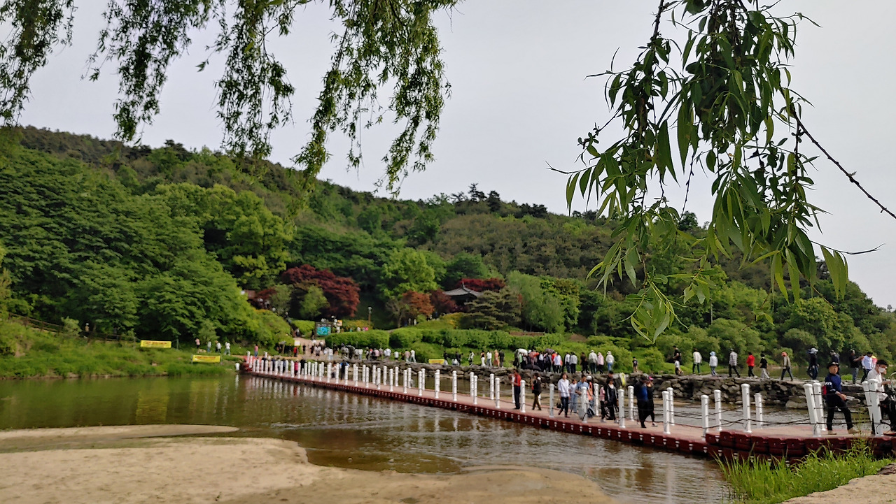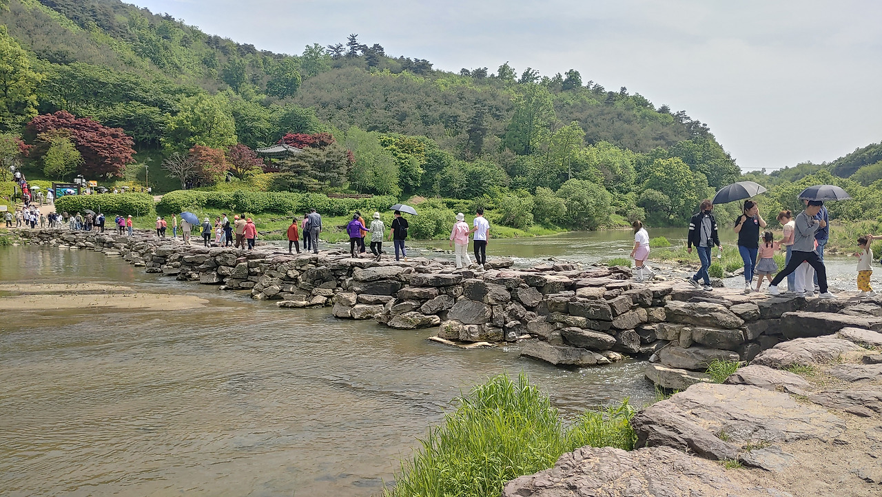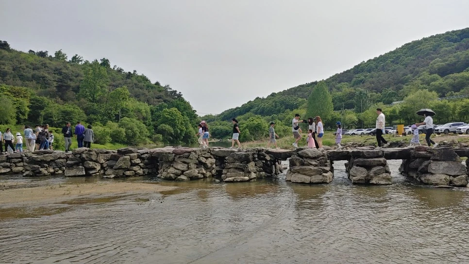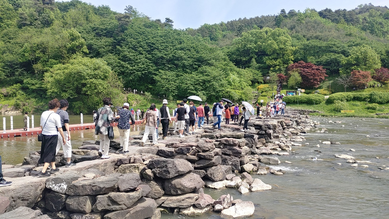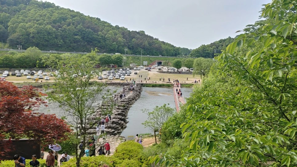 사람들은 긴 줄을 새롭게 만들며 자동차 길 한편을 걸었고, 반대 방향으론 더 긴 줄을 그리며 차량들이 계속 밀려 들어왔다. 찬란한 봄날이니 이 정도 붐비는 것은 당연하다 싶기도 했고, 이런 북적거림조차 농다리 주변 조용한 풍경과 묘한 조화를 이뤄냈다.
