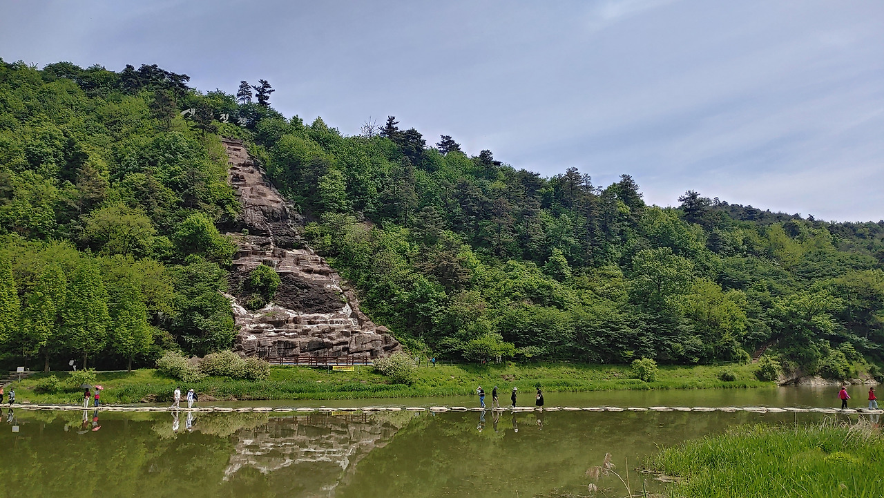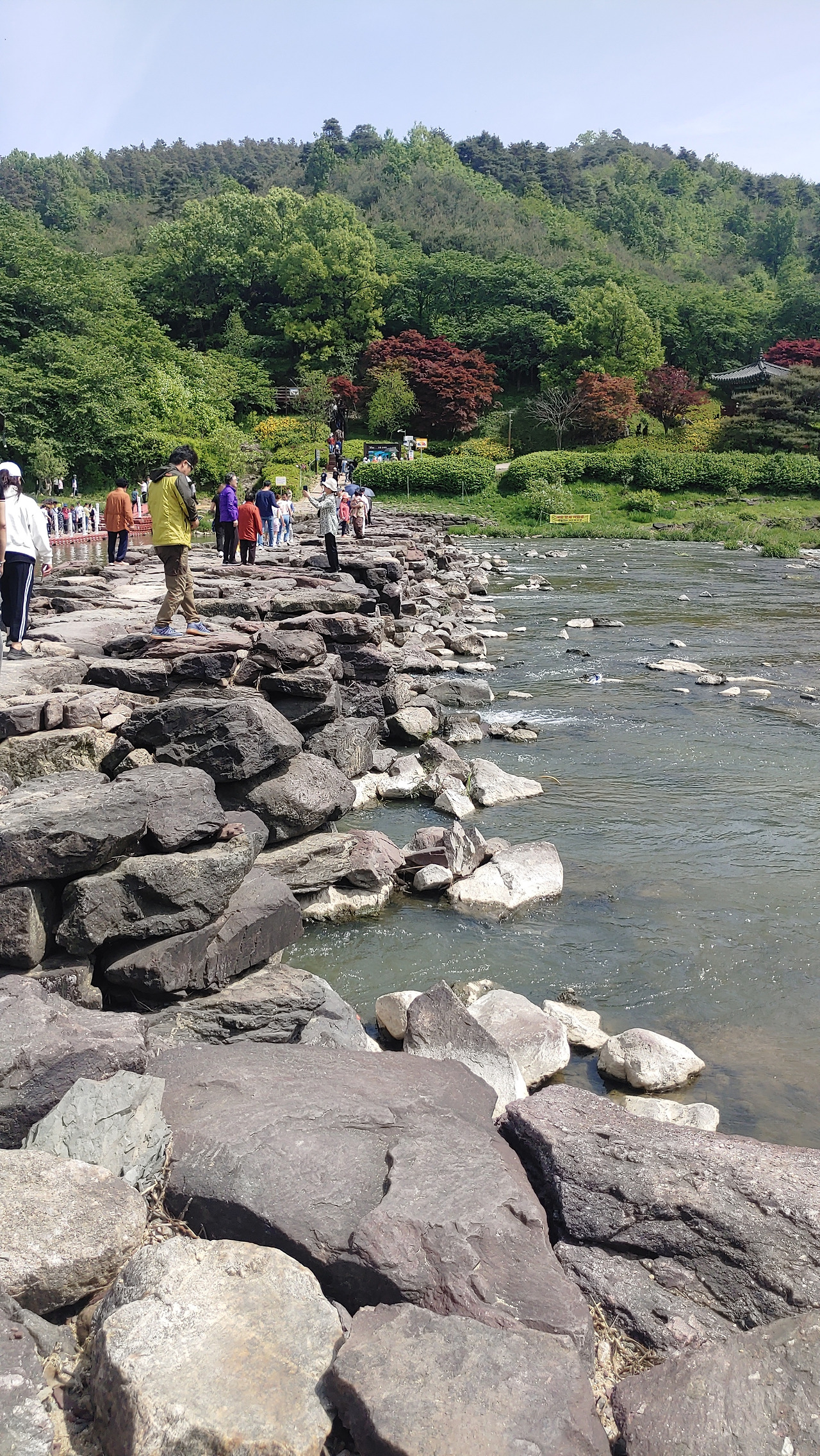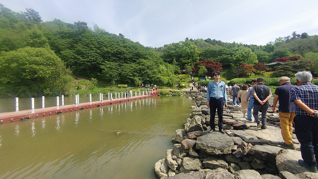 사람들은 긴 줄을 새롭게 만들며 자동차 길 한편을 걸었고, 반대 방향으론 더 긴 줄을 그리며 차량들이 계속 밀려 들어왔다. 찬란한 봄날이니 이 정도 붐비는 것은 당연하다 싶기도 했고, 이런 북적거림조차 농다리 주변 조용한 풍경과 묘한 조화를 이뤄냈다.