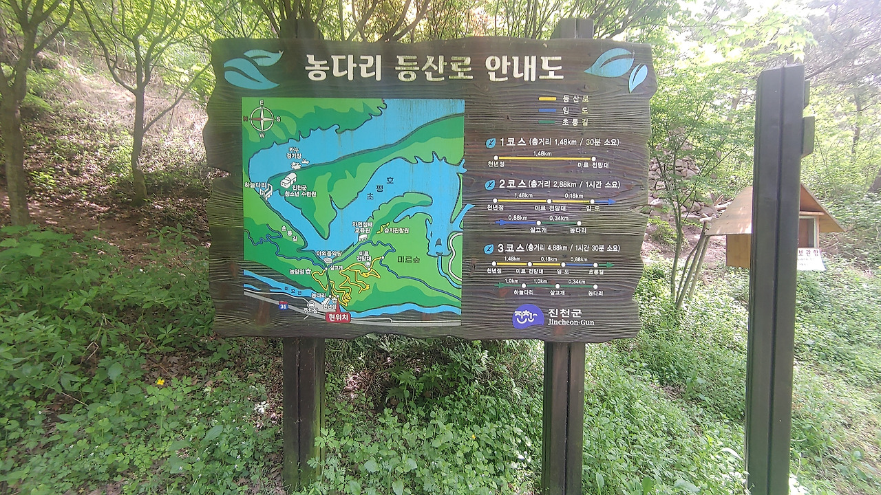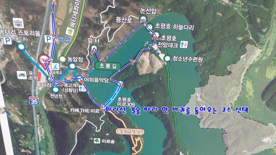 제4주차장 출발 -> 농다리 -> 용고개 -> 야외음악당 -> 초평호 둘레길 -> 초평호 미르 309 출렁다리 -> 초평호 하늘다리 -> 쉼터 -> 야외음악당으로 이어지는 초롱길을 한 바퀴를 돌았다.