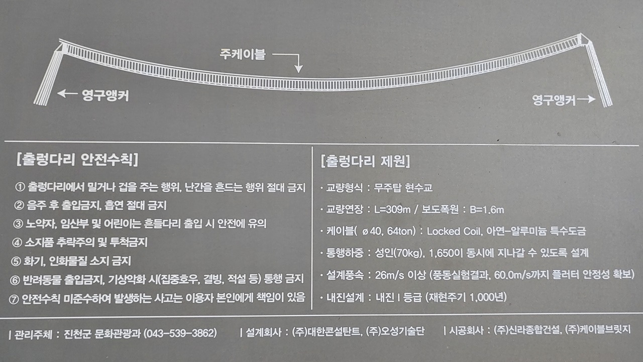 총 309m 길이의 이 출렁다리는 중간 교각이 없는 '무주탑' 방식으로 2021년부터 4년간 80억 원이 투입되었다고 한다.