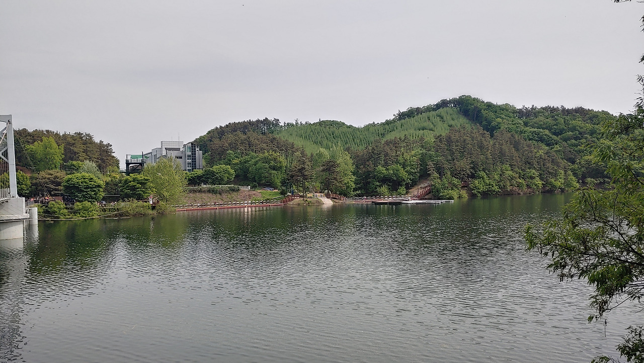 야외음악당에서 바라본 초평호와 출렁다리