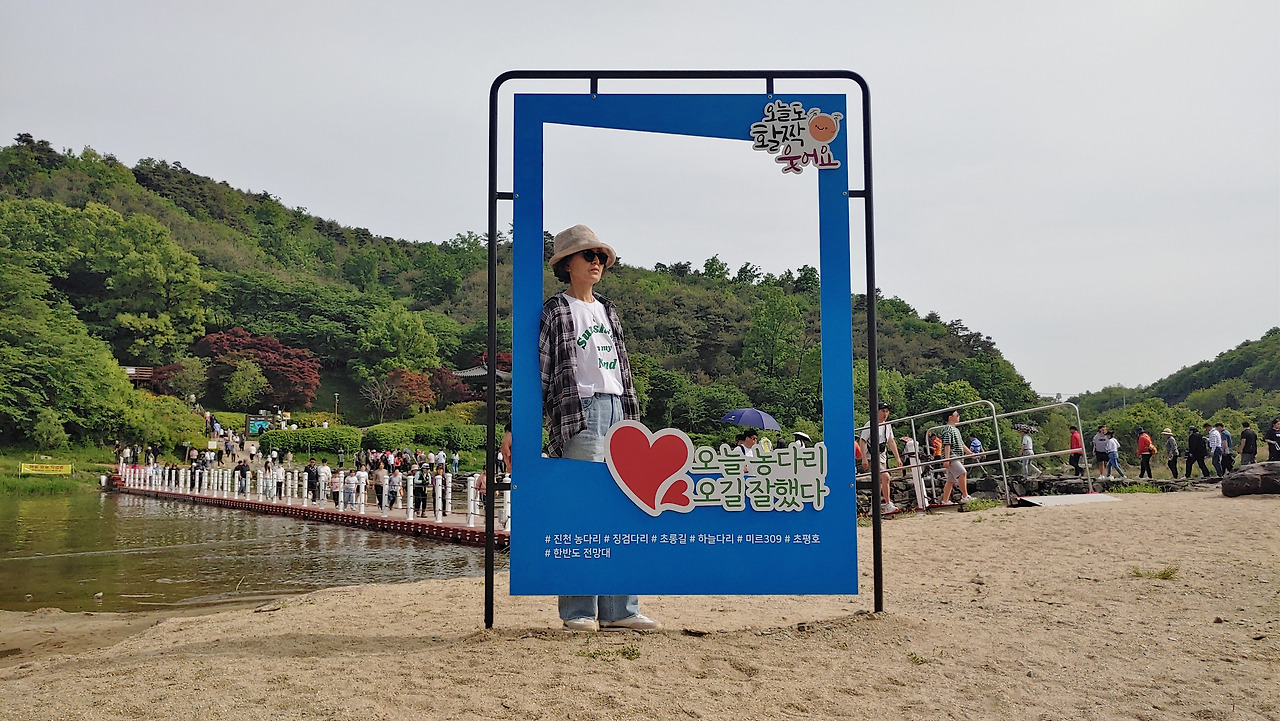 부표교 앞 포토존에서 찰칵 / 부표교와 농다리를 오가는 사람들