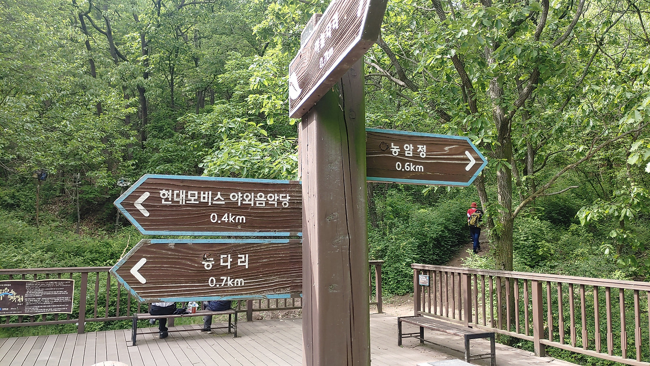 400m 앞에 야외음악당이 있다고 알리는 반가운 표지판 / 멀리 보이는 미르 309 출렁다리 야외음악당에서 용고개를 넘어 조금만 더 걸으면 드디어 농다리가 보인다.
