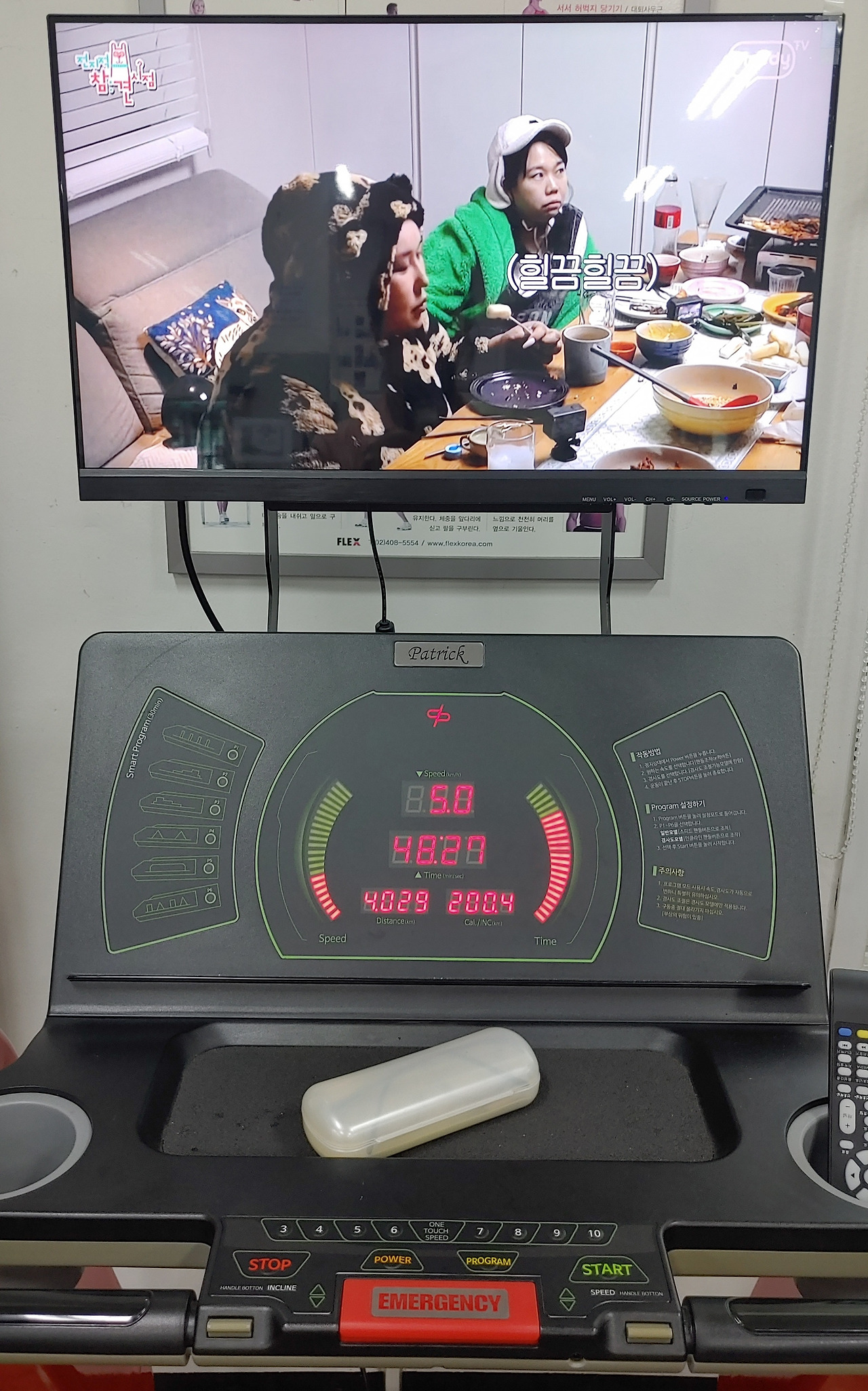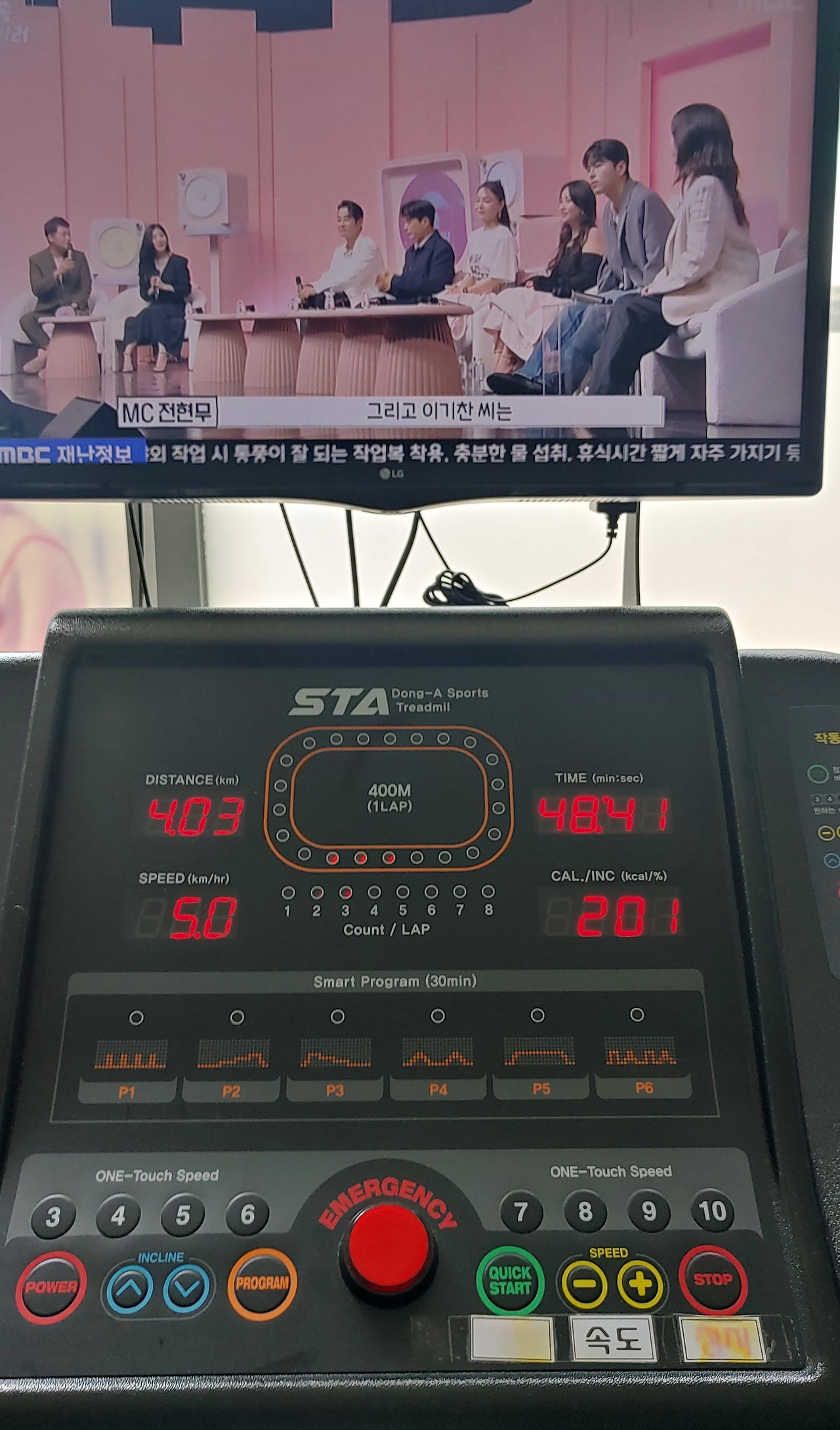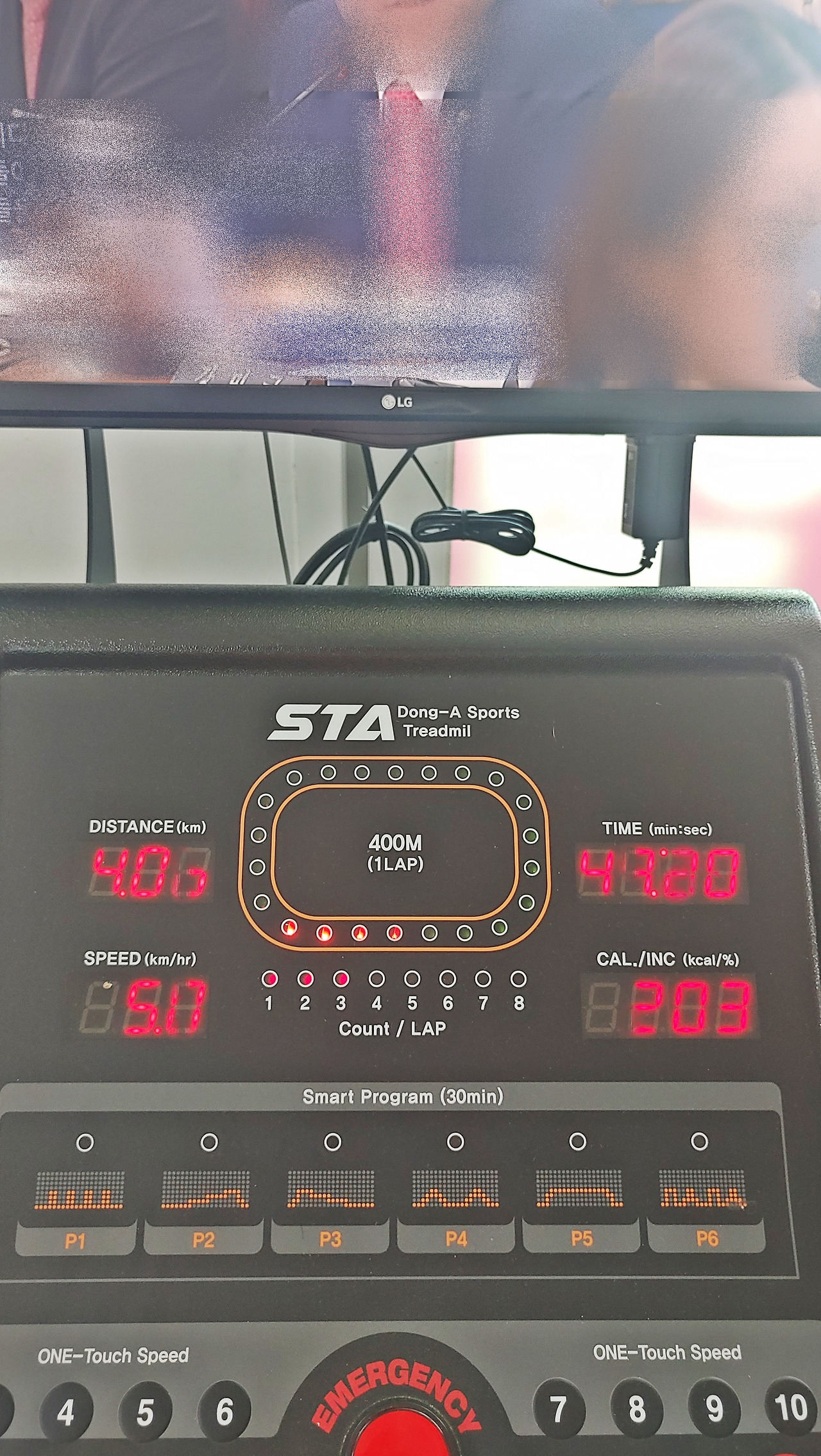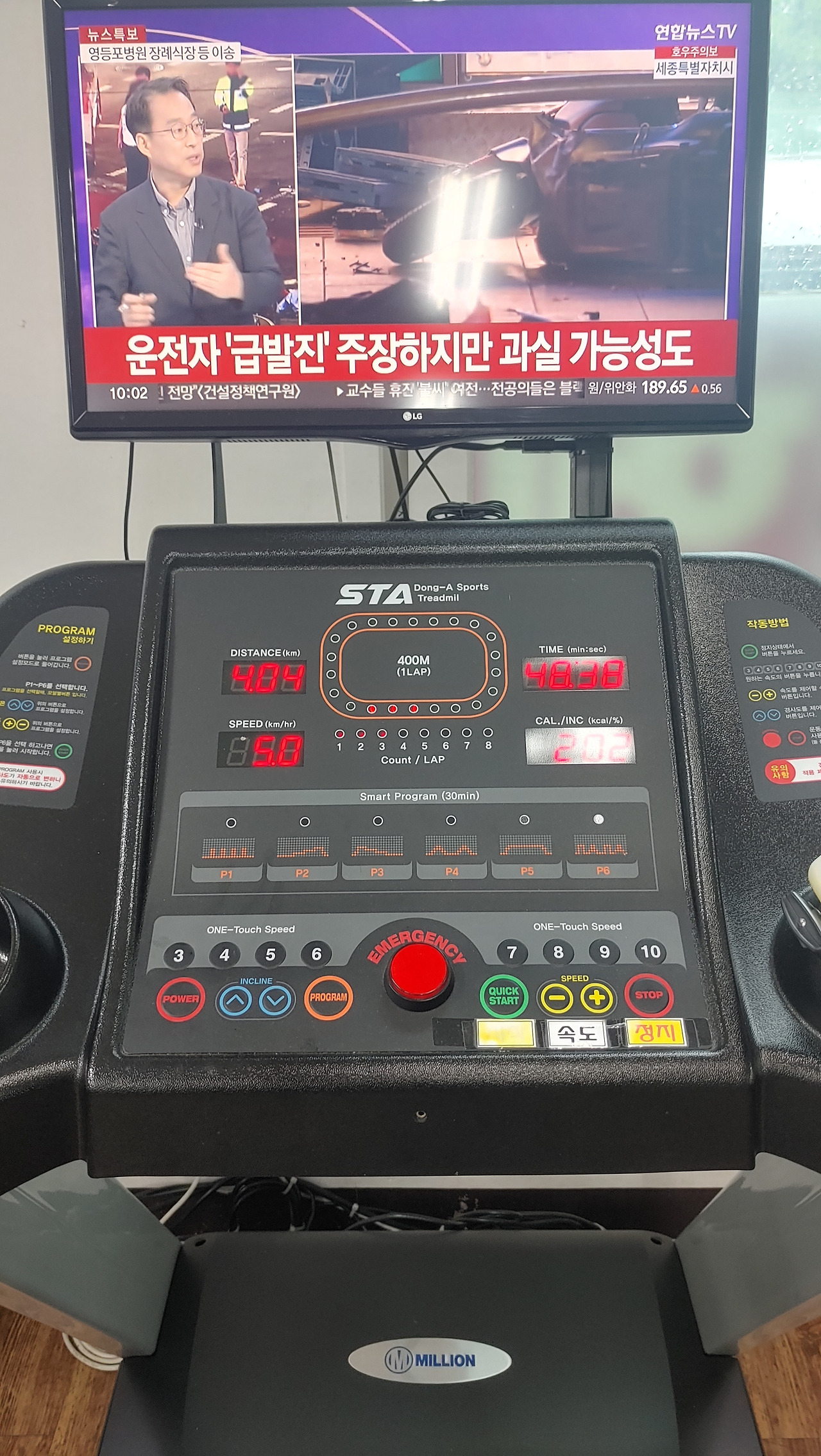 4km를 걷고나니, 49분이 흘렀다. 새소리 대신 TV뉴스를 들으면 달렸다.
