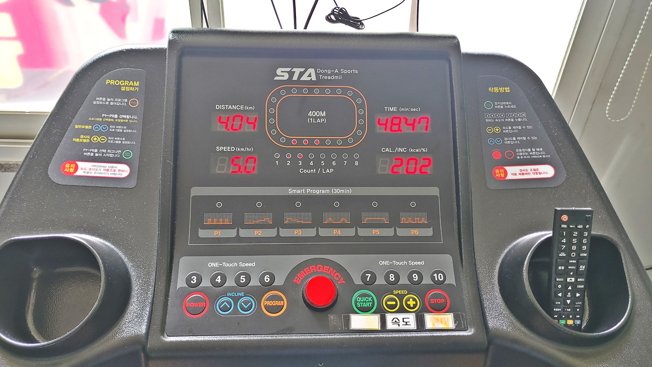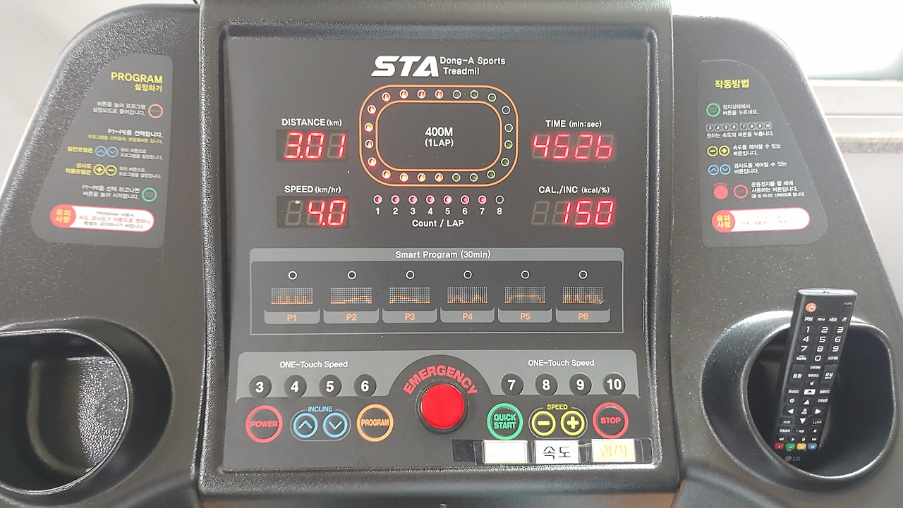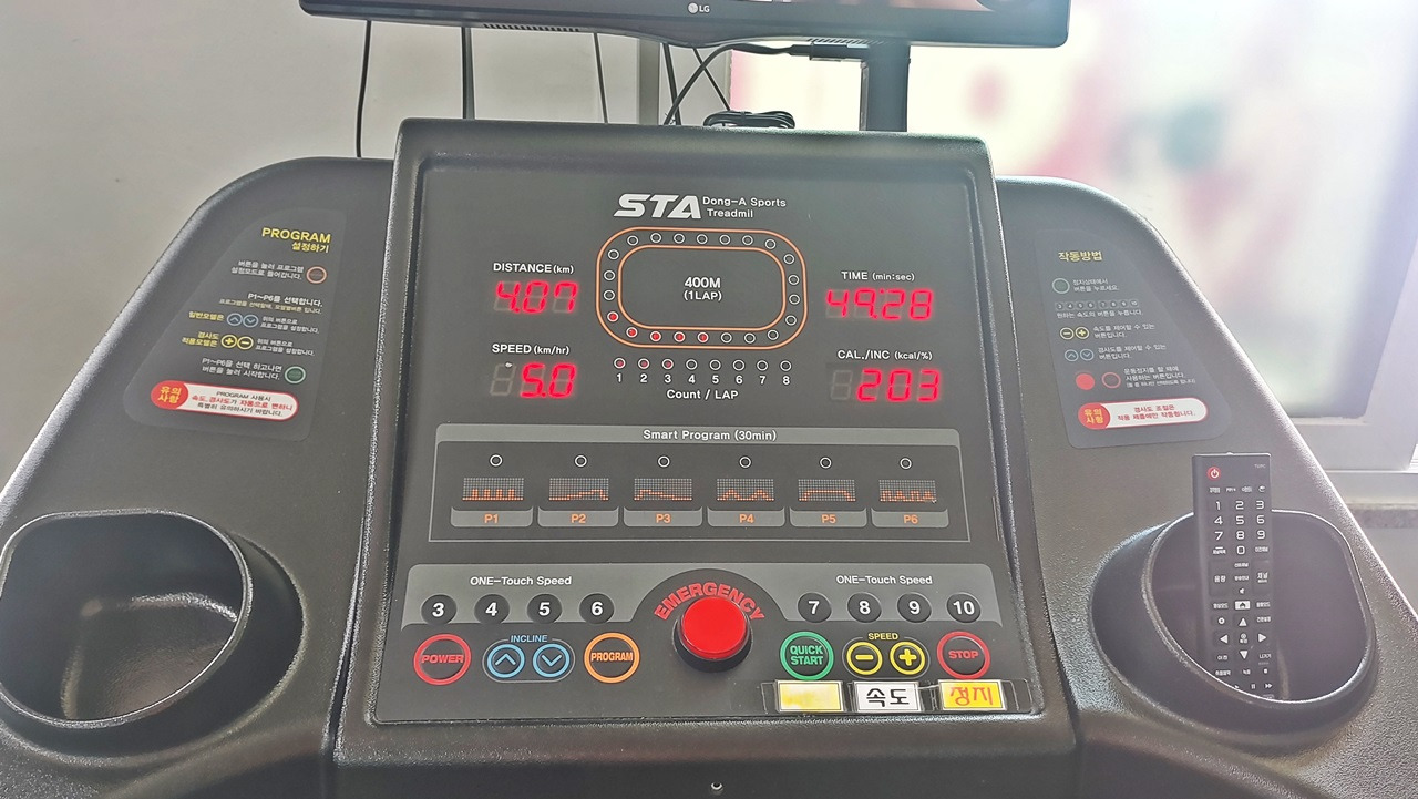 젊은 사람은 근육강화 운동 중이었고, 중년의 2 사람은 러닝머신 위에서 달리기 중이었다. 모르는 운동기구들이 많아 잠시 어물쩡거리며 둘러보니, 역시 러닝머신이 가장 만만했다.