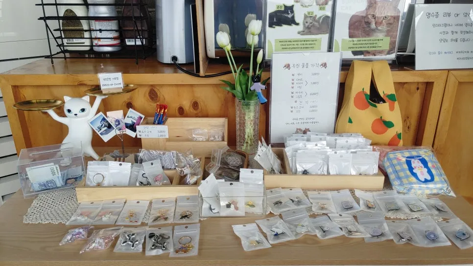 고양이들의 건강한 식사와 안전한 보금자리를 위해 후원금을 모으고 있었다. 카페 한쪽에 후원물품을 전시해 놓고 팔고 있었다.