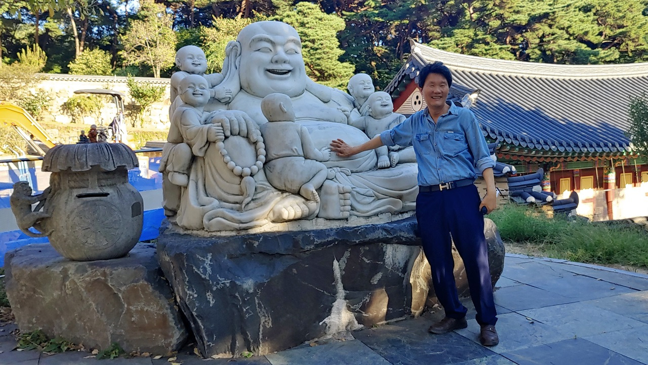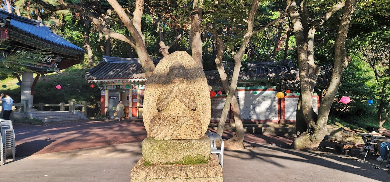 대웅전으로 오르기 전, 칠 층 석탑 근처에서 포대화상이 불뚝배를 내밀고 중생들을 향해 웃고 있었다.