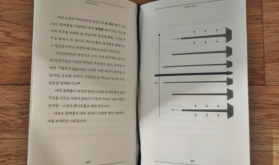 저자 로벨리는 블랙홀의 일생을 촬영하고 영상을 거꾸로 재생하다고 상상한다면, 화이트홀을 보게 될 것이라고 한다.
