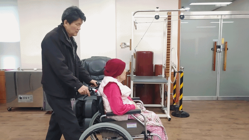 사무실 담당자의 특별 배려로 어머니는 아들이 밀어주는 휠체어에 앉아, 물리치료실과 넓은 1층 로비를 자유롭게 돌아볼 수 있었다.