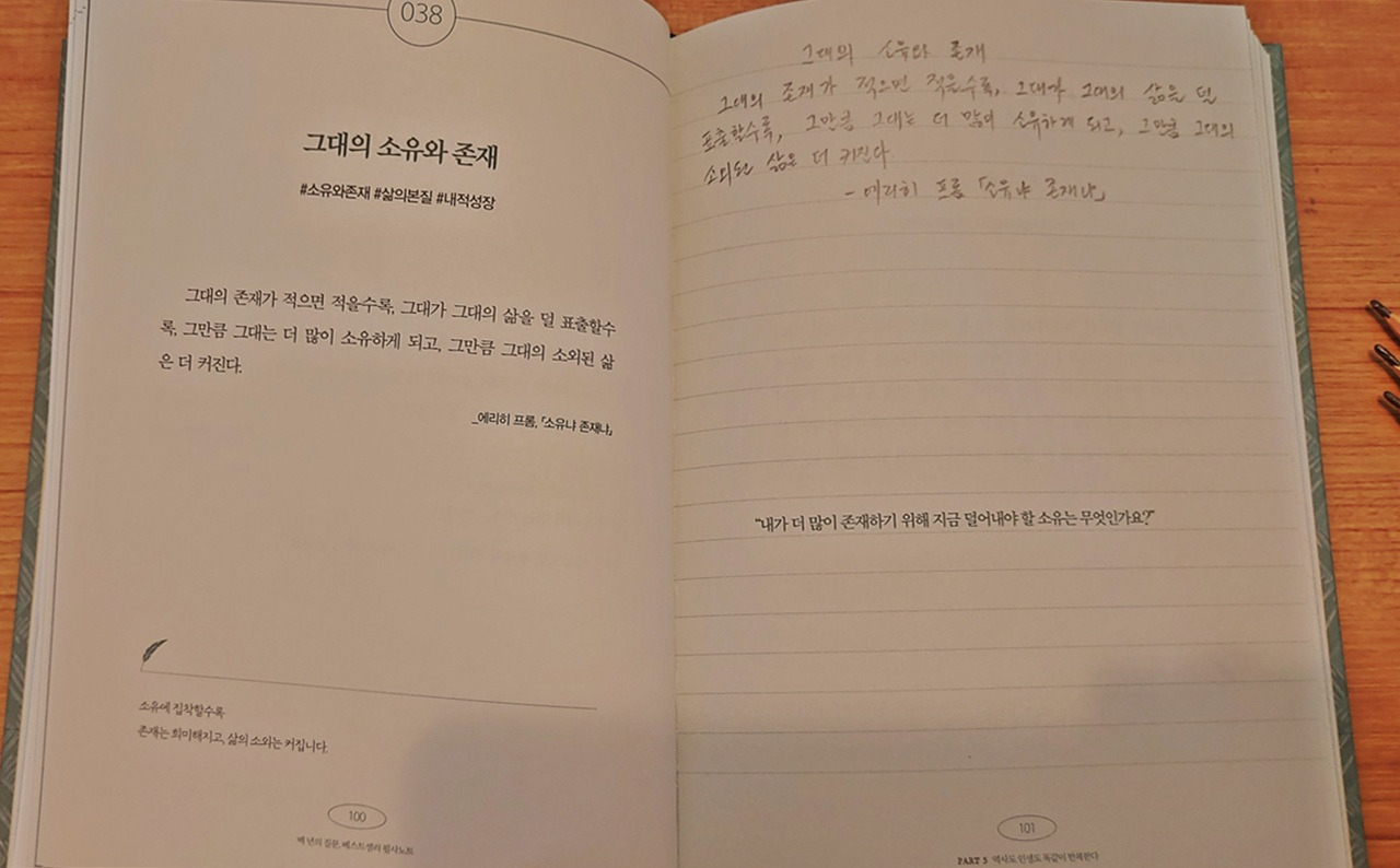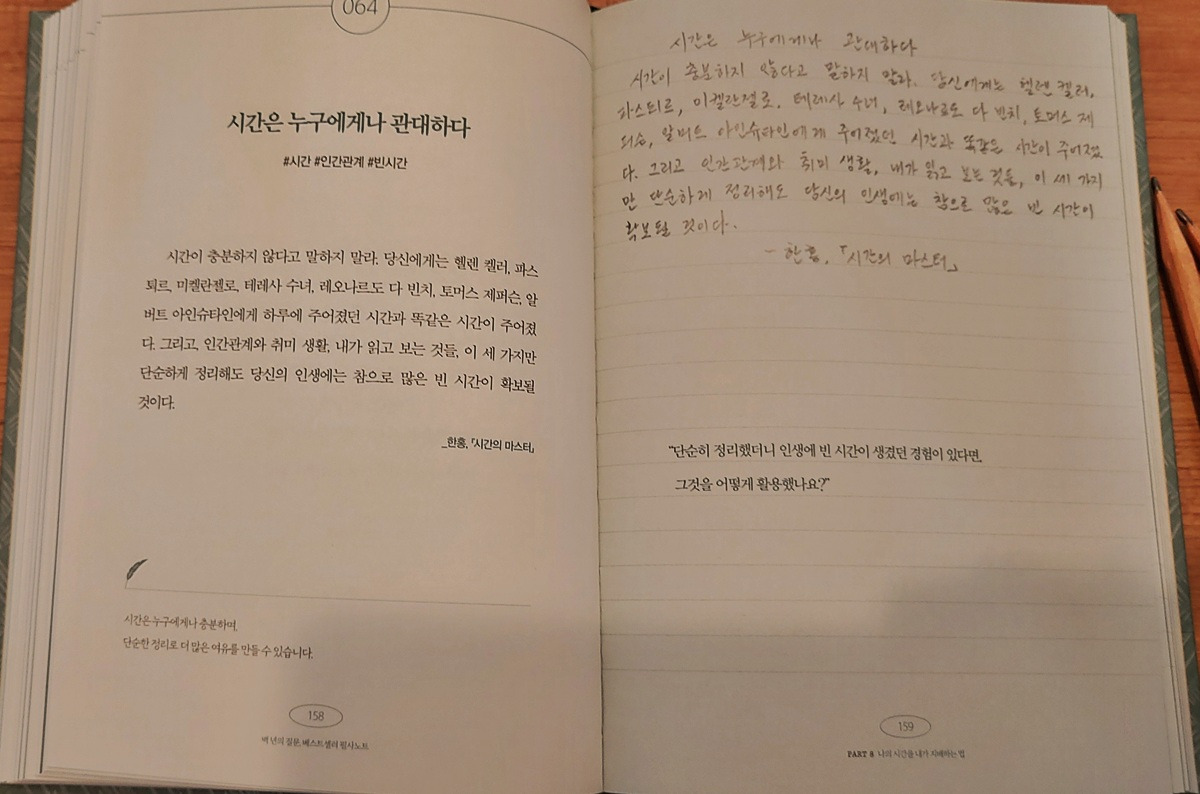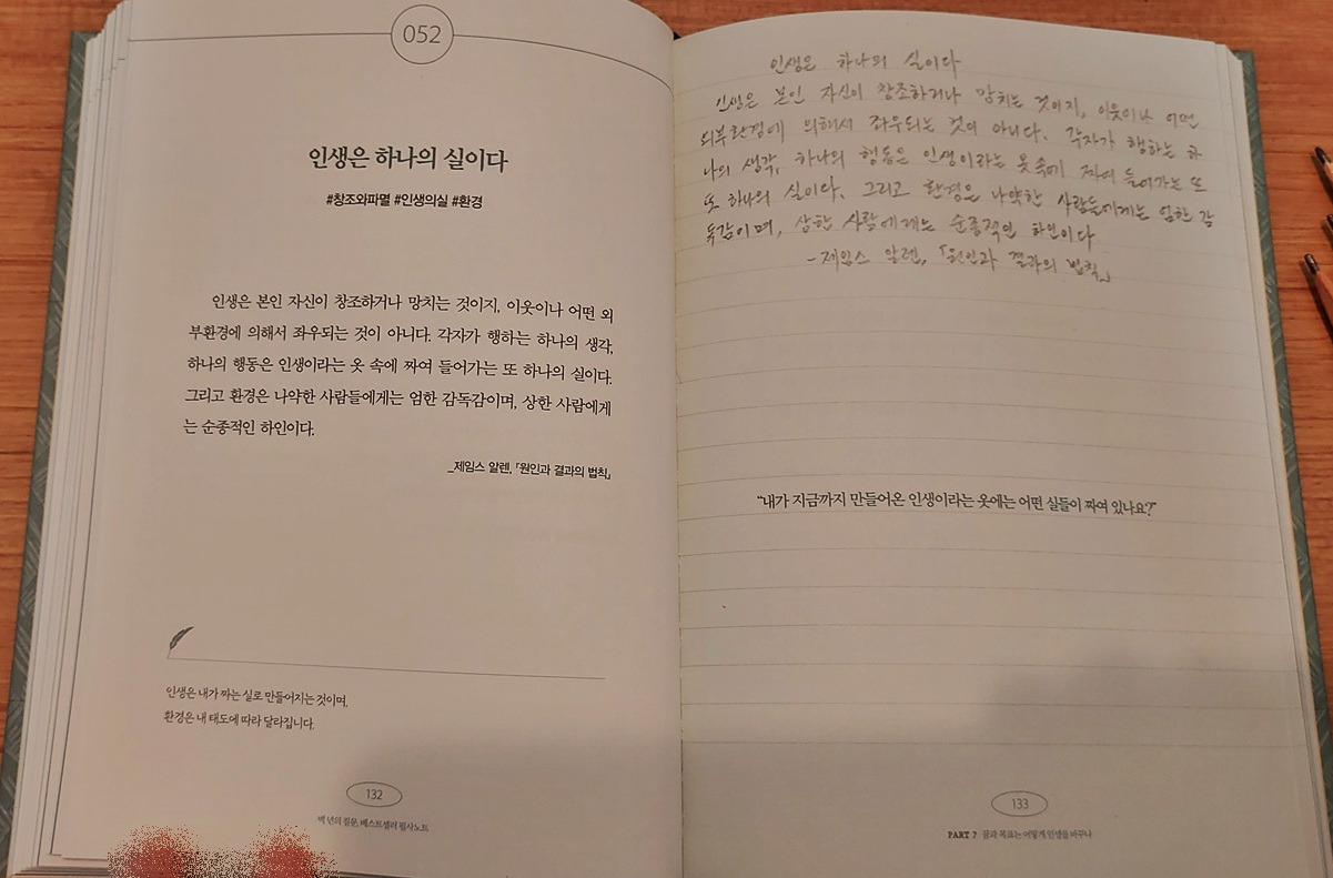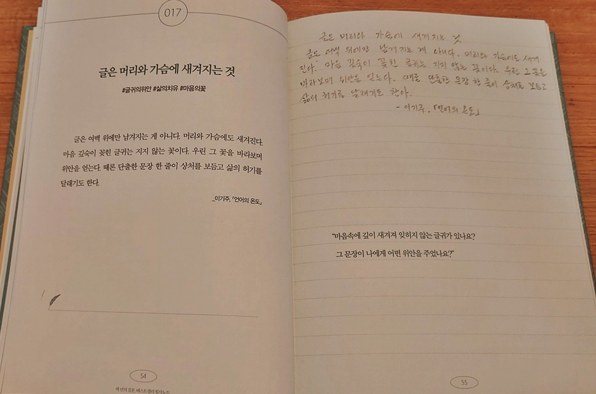 『백 년의 질문, 베스트셀러 필사 노트』 책 속에 담긴 다양한 구절을 통해 많은 분들의 삶과 이어진 우리의 이야기를 마주했다. 우리와 다른지 않은 고민, 우리와 비슷한 꿈과 목표, 그리고 시공간을 관통하는 관계의 중요성을 새삼 깨닫게 된 시간이었다.