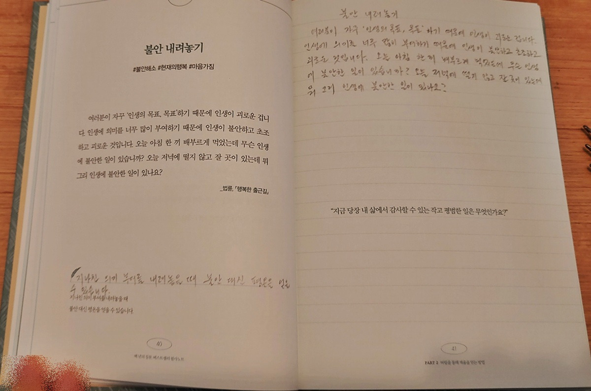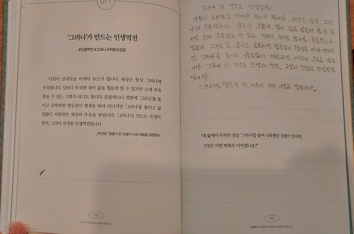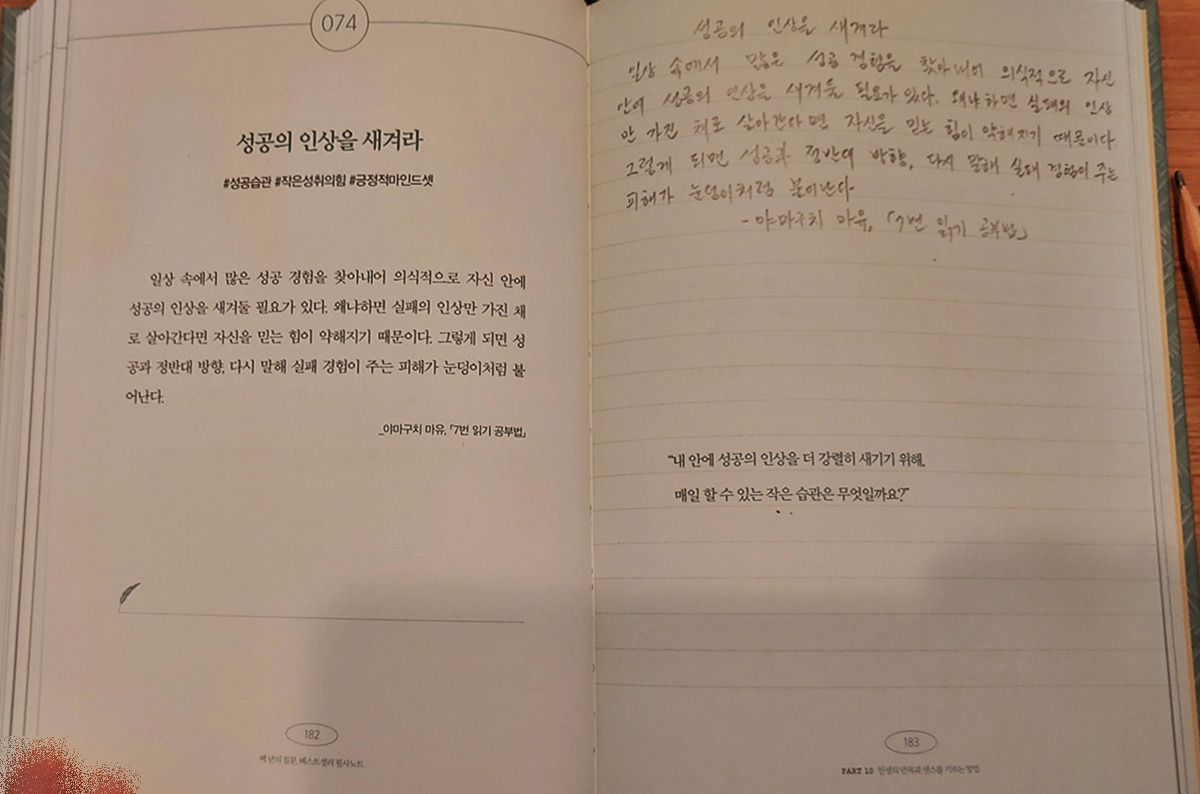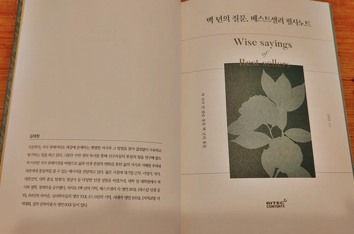 『백 년의 질문, 베스트셀러 필사 노트』 책 속에 담긴 다양한 구절을 통해 많은 분들의 삶과 이어진 우리의 이야기를 마주했다. 우리와 다른지 않은 고민, 우리와 비슷한 꿈과 목표, 그리고 시공간을 관통하는 관계의 중요성을 새삼 깨닫게 된 시간이었다.
