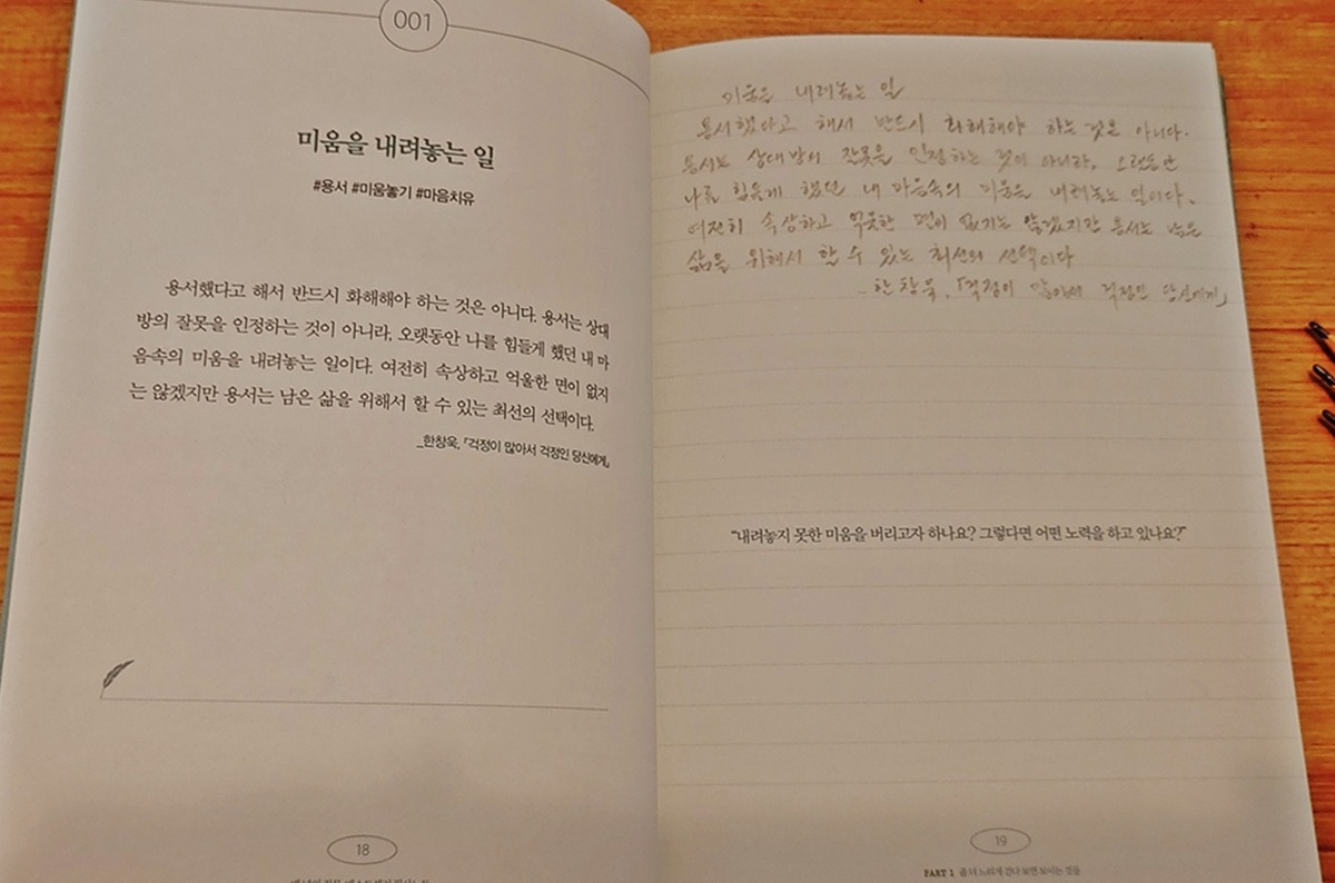 책 속 한 줄 내용을 읽고, 그 구절을 천천히 음미하며 베끼어 쓰다 보면 뒤죽박죽 어지러운 현 상황이 쓱 뒤로 물러선다. 조금 느리게 세상을 바라보며 채우기만 하려던 조급함을 밀어내면, 오늘이 비로소 또렷하게 보이기 시작한다.