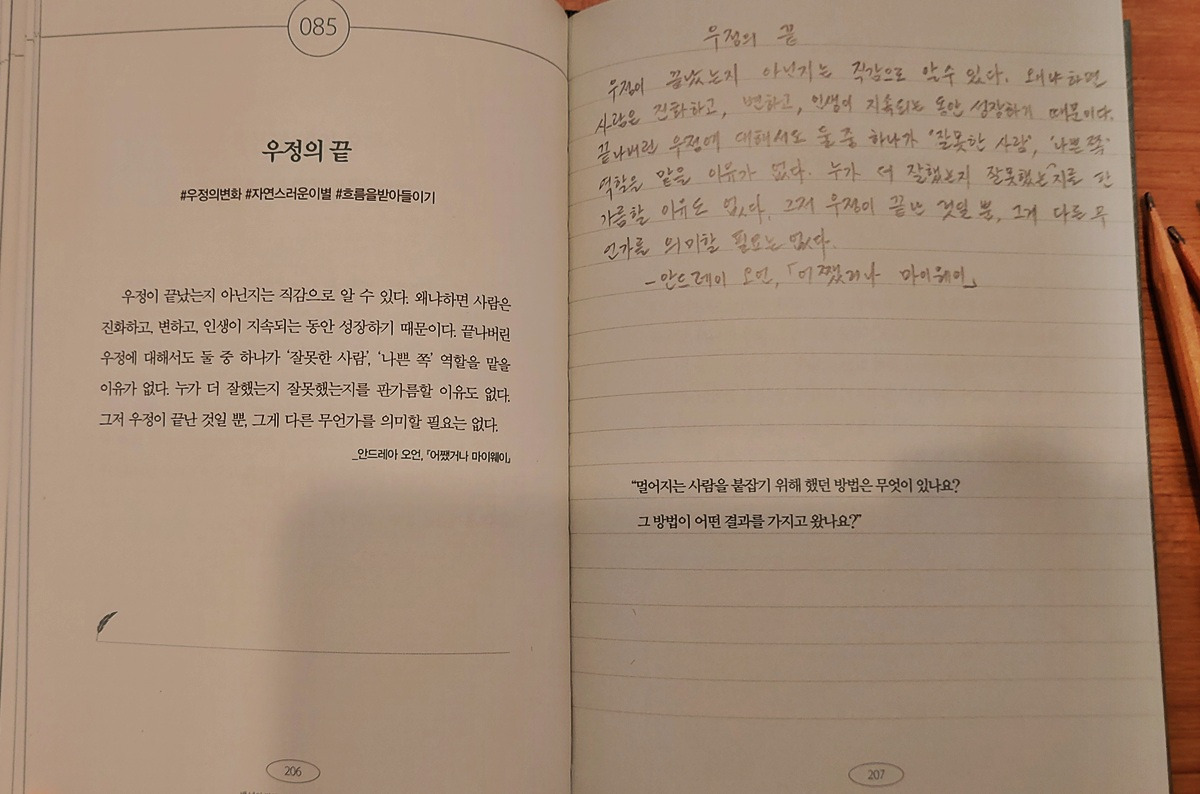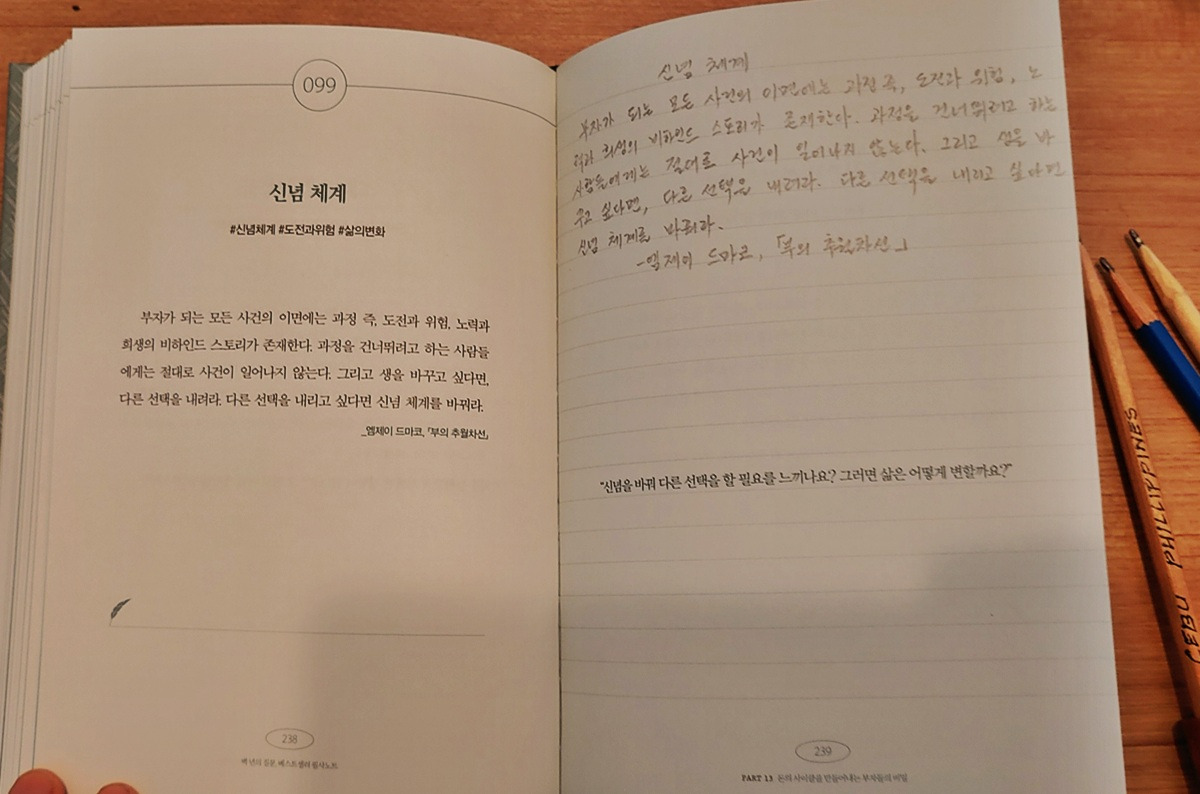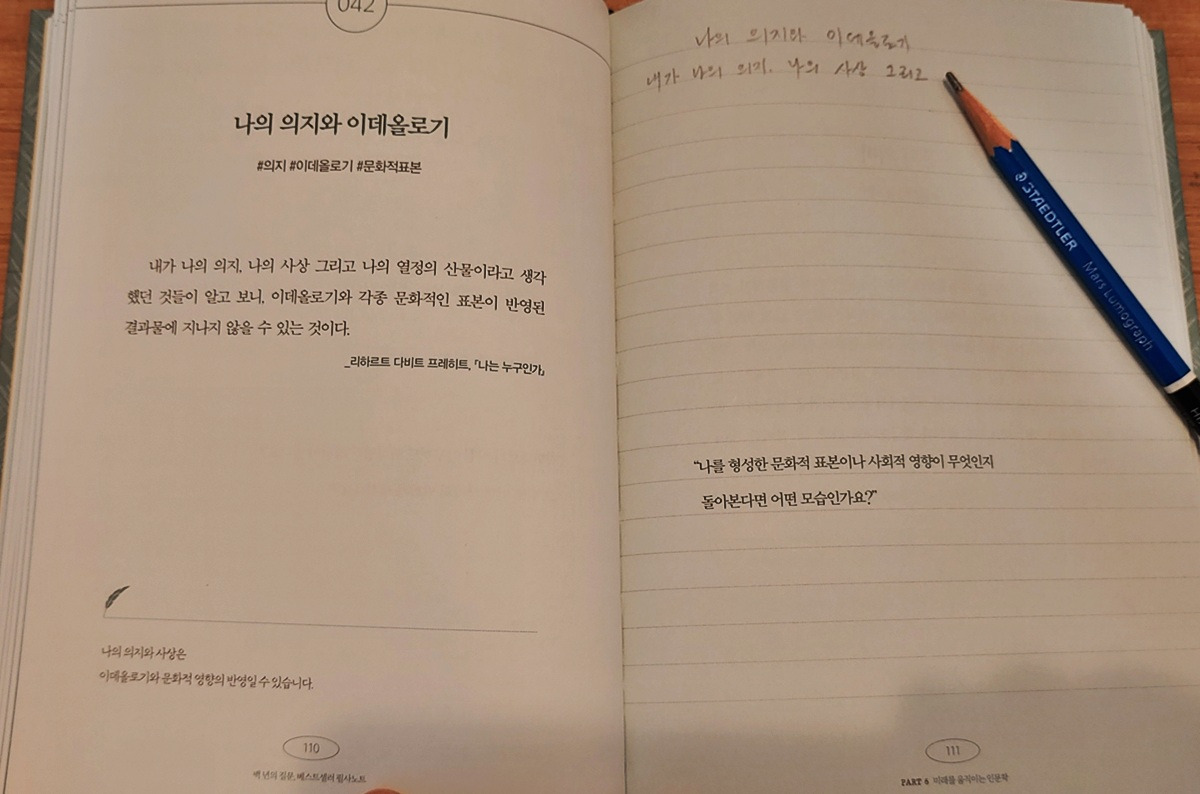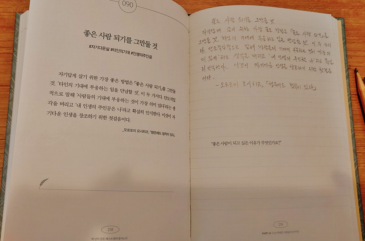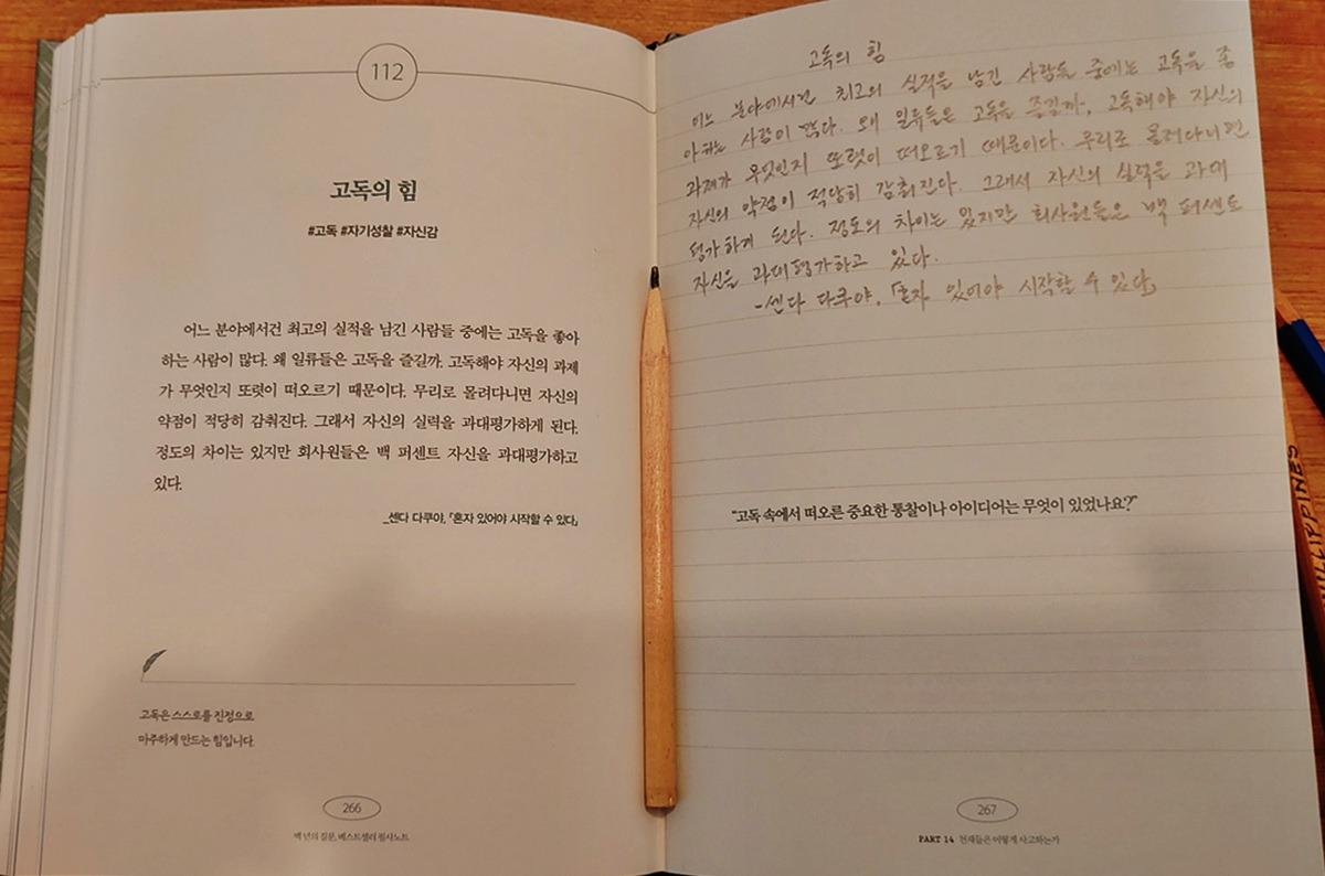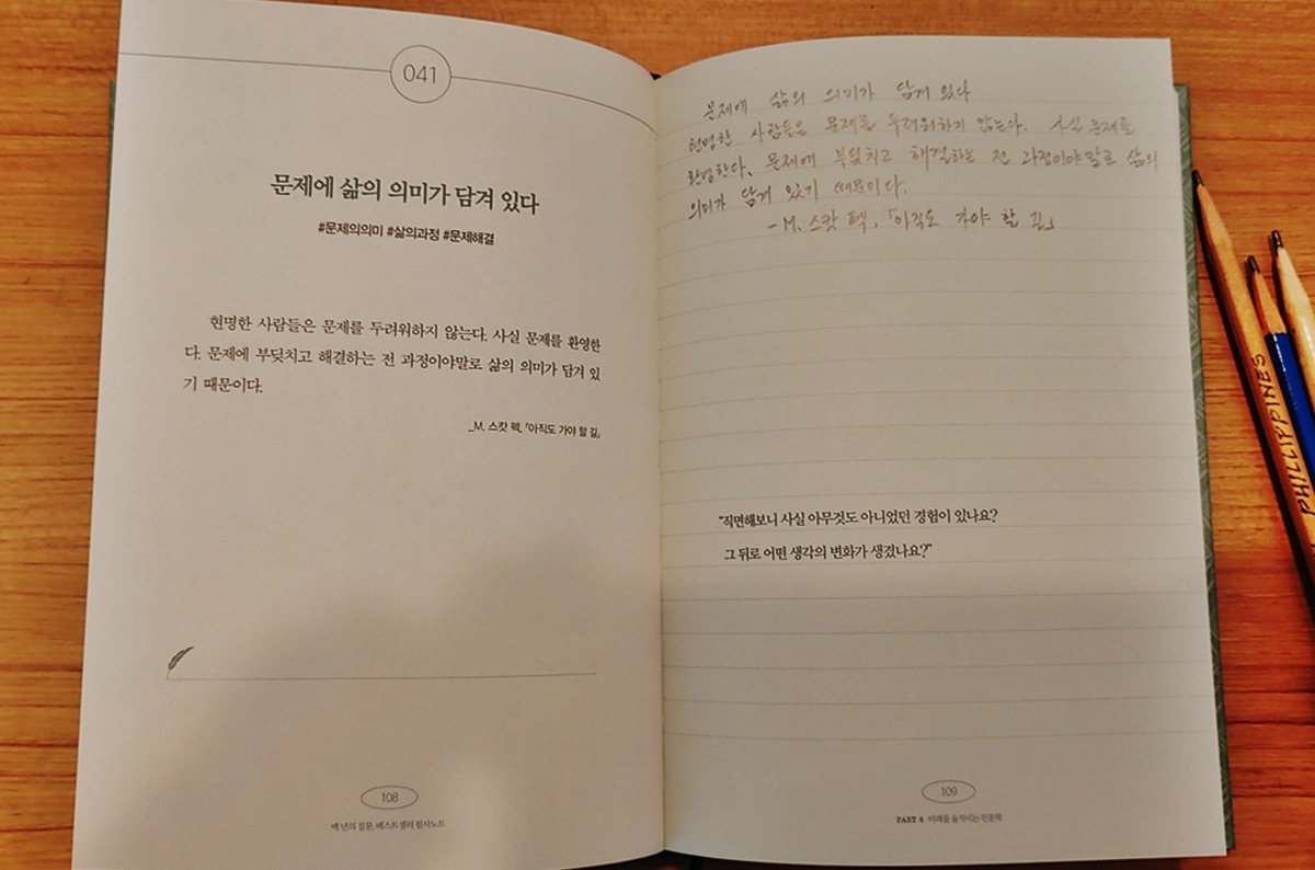 손에 쥔 낡은 연필로 한 줄 내용을 써가다 보면, 삶에 던져진 질문의 답과 닿게 되니 -요사이 부쩍- 지친 삶에 위안이 된다. 우리가 늘 바르게 살고자 얻기 위한 물음들은 한결같은 맥락으로 오랜 세월 이어져 왔으며, 한 권의 책 『백 년의 질문, 베스트셀러 필사 노트』가 지금 내게 그 답을 주고 있다.