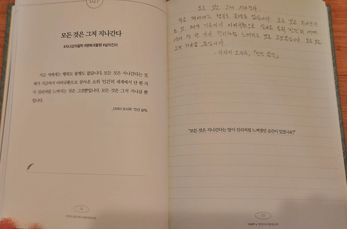 이 책의 부제 '필사로부터의 질문, 나를 알아가는 시간'처럼 읽고 쓰는 과정을 통해 나의 모습을 직면하는 계기가 됐다.