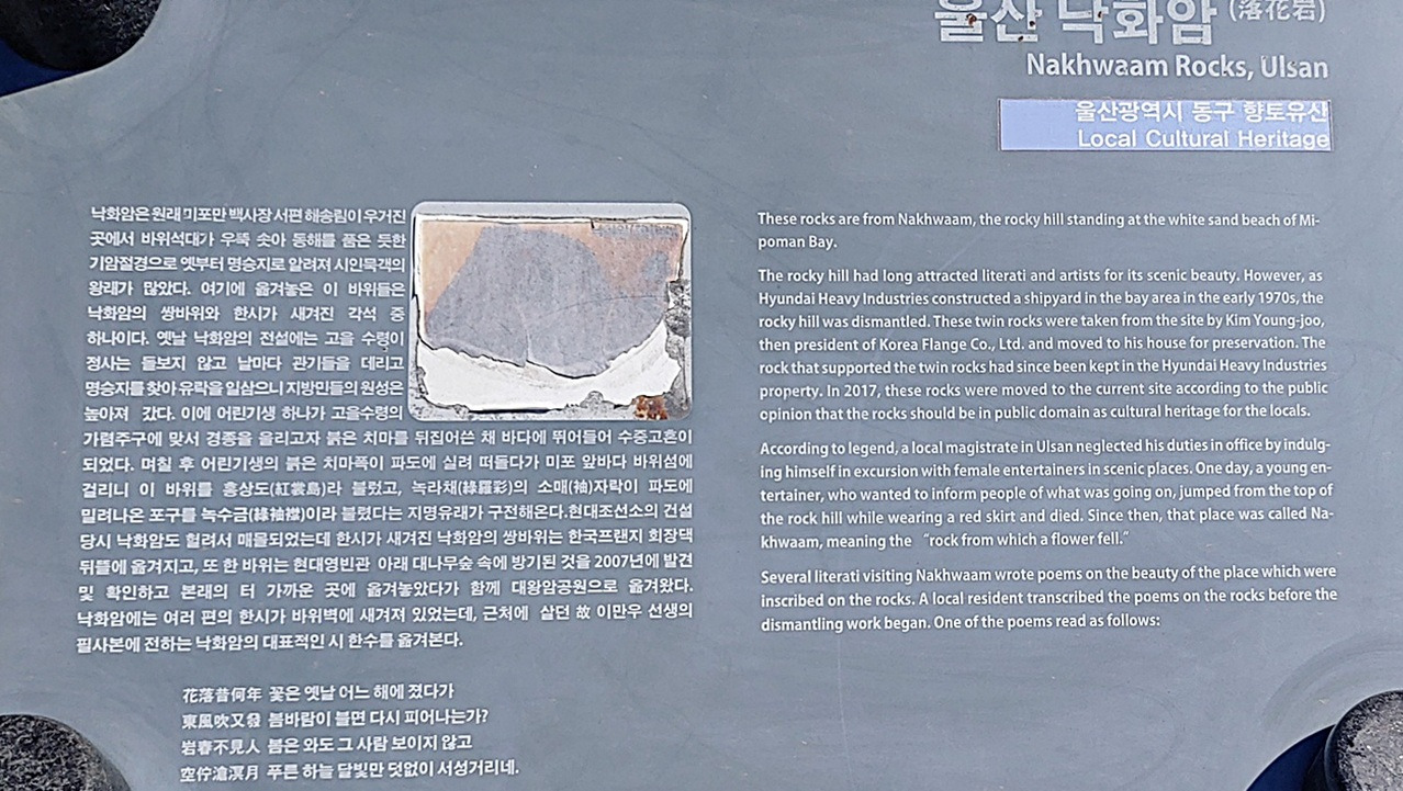울산 낙화암에서 옮겨놓았다는 '낙화암 쌍바위'와 '한시가 새겨진 각석'이 반겨준다.