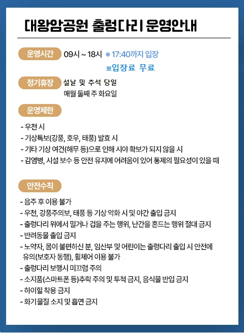 대왕암공원 출렁다리('20. 8월 ~ '21. 6월 준공)는 무주탑현수교 길이 303m, 보행 쪽 1.5m, 높이 42.55m(가운데 27.55m)에 달하며, 내진 1등급, 최대풍속 64m/s 바람에 대한 안전성이 확인되었고, 출입인원은 최대(성인 70kg 기준) 1,285명에 이른다.