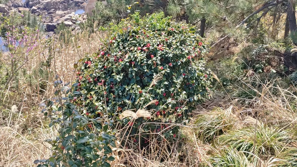 아래 동백나무는 붉은 꽃과 초록 잎을 무거울 정도로 다닥다닥 달고 서서 해풍을 맞고 있다.