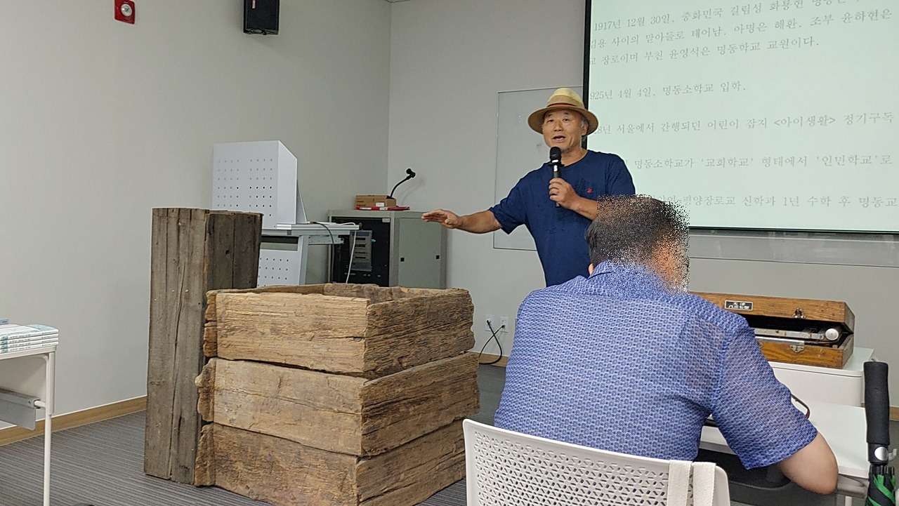 강사인 박해환 시인은 '문학 산촌'(천안 광덕 소재)에 보관 중이던, 윤동주 시인 생가인 용정에 있던 우물과 110년 된 우물 굴뚝, 초등학교 4학년 때 동주 어린이가 쓰던 등사기까지 직접 가져와 강의를 더 실감 나게 빛내 주었다. 이 우물은 서울 인왕산 자락에 있는 윤동주 문학관에 있던 우물과 같은 우물이다. 원래 6칸 높이의 우물이었는데 3칸씩 2곳에 나누어져 전시 보관 중이다.