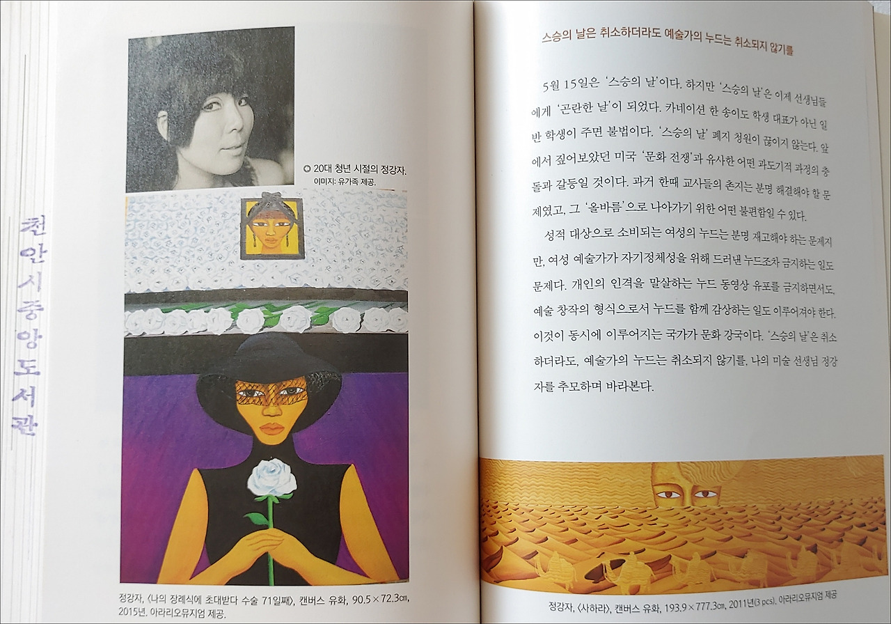 정강자(1942~2017)는 우리나라 최초의 여성 행위예술가이다. 1967년 12월 <비닐우산과 촛불>이라는 최초 행위예술에 참여했고, 두 번째 행위예술은 1968년 6월 <투명 풍선과 누드>였다. 쎄시봉 감상실에서 존 케이지의 음악을 배경으로 이루어진 <투명 풍선과 누드>는 예술의 고정관념에 항의한 작품이다. 당시 풍기문란죄로 정강자를 체포하기 위해 많은 경찰들이 출동했으나, 한국일보 허영환 기자의 도움으로 구속만은 피할 수 있었다.