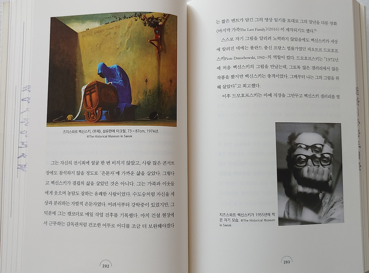 20세기 초 프로이트 심리학이 등장하고, 초현실주의 예술이 유행하면서 은밀한 매력의 그로테스크는 더 흔해졌다. 한국과 닮은 폴란드의 아픈 역사를 알고 나면, 벡신스키의 환시 미술을 감상하는 데 도움이 된다. 작품이 독특하다 보니 인터넷에서는 벡신스키의 작품들이 '우울증 걸린 사람이 그린 그림', '자살한 사람이 그린 그림' 등으로 알려져 있으나, 정작 벡신스키는 꽤 유쾌하고 대화하는 것을 좋아했다. 다만 부끄럼을 타는 성격이었는지 외출을 꺼리고, 전시회나 박물관 행사에도 참석하지 않았다고 전해진다.
