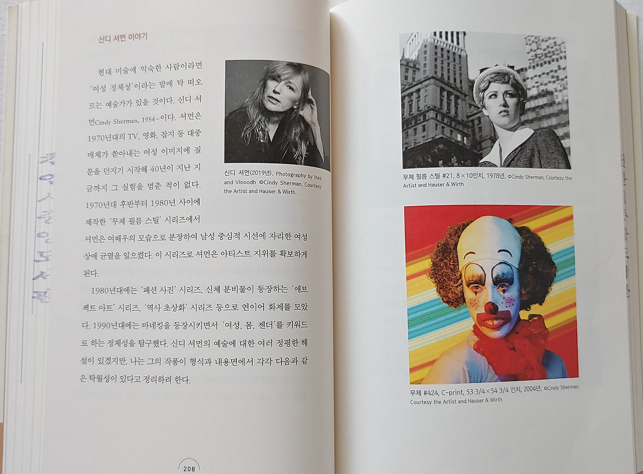 예술 내용: 셔먼의 작업은 페미니즘 미술사의 큰 축이 되었고, 그녀의 탁월성은 40년을 일관되게 관통하는 "내가 누구로 보이니?"라는 질문이다. 실제 하는 나는 그대로인데 의상, 소품, 관계하는 사람, 언어. 지역의 다름으로 나를 바라보는 타인의 시선이 다를 뿐이라는 결론에 도달하면, 오히려 위로와 치유가 된다.