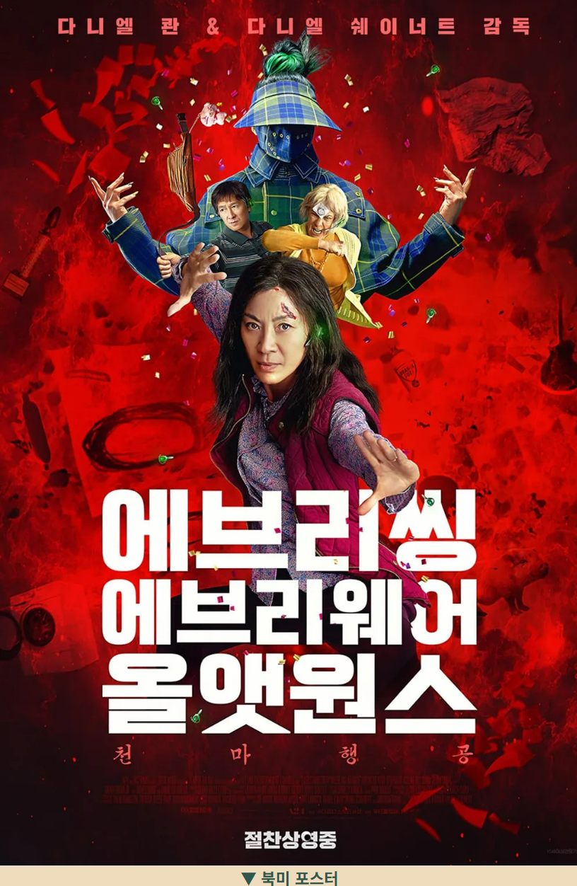 <에브리 싱 에브리웨어 올 앳 원스 Everything Everywhere All At Once, 2022>는 기존 영화의 예술 형식을 빌려오지만, 내용 면에서는 한 여성을 다양한 삶 속으로 넣었다 빼는 방식으로 정체성을 탐구하도록 한다.
