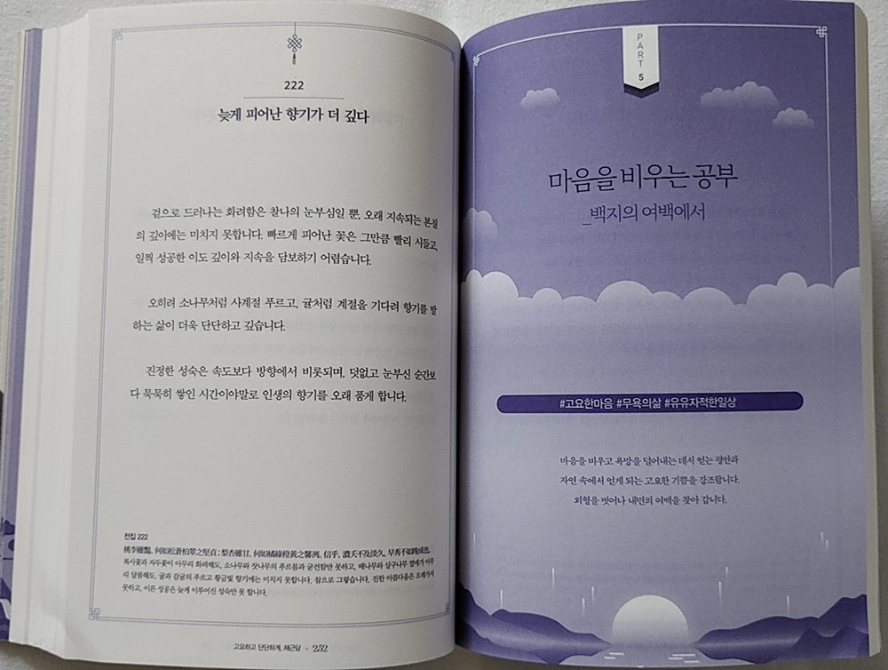 마음이 정화되면 굳이 무엇을 붙잡지 않아도 삶은 깊고 향기롭게 다가온다. 이는 소유가 아닌 '존재'의 고요함에서 비롯되는 것이다.
