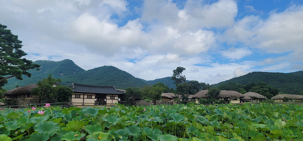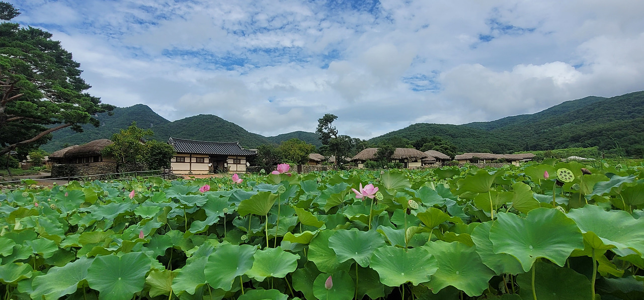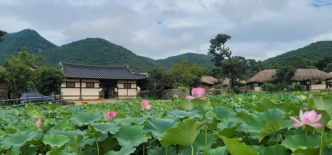 연꽃 군락지 뒤로 펼쳐진 야트막한 구릉지에 한옥들이 모여있다.