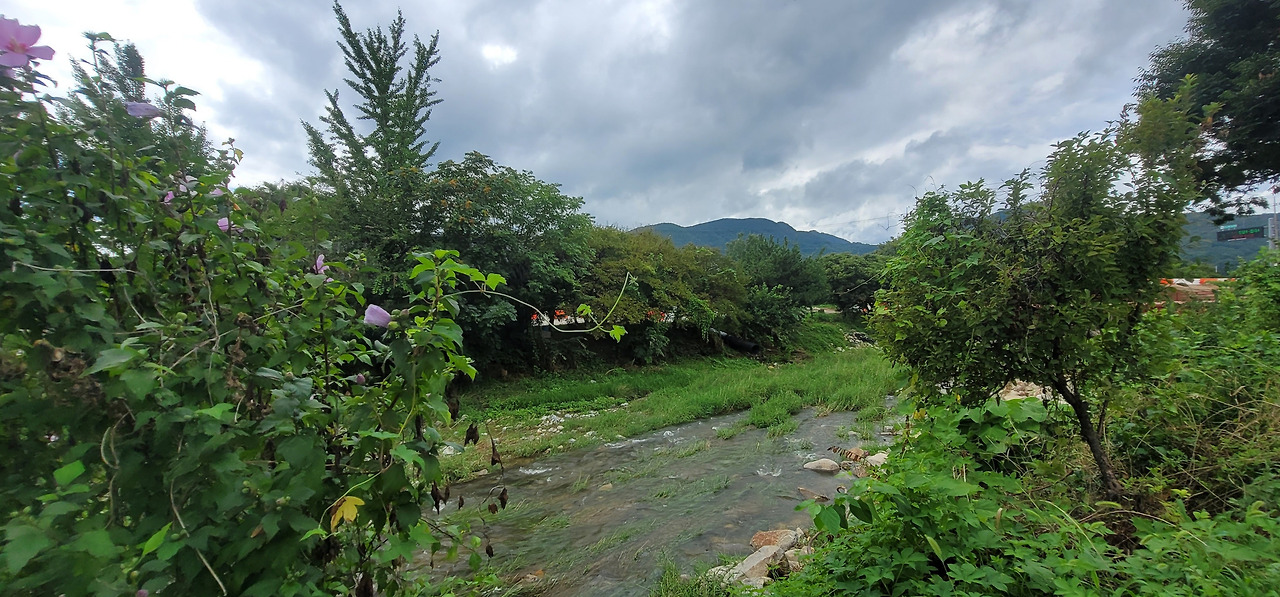 외암마을 앞으로 흐르는 냇물 근처 수풀과 무궁화나무도 짙은 초록색으로 빛났다.