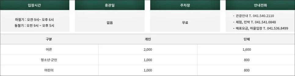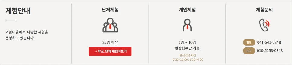 감자수확, 강정 만들기, 고구마 캐기, 고추장 체험, 화톳불 체험(고구마, 밤), 도자기 냄비받침 액자, 도자기 풍경 이야기, 떡메치기, 미션! 문화재를 찾아서, 방문걸이, 솜사탕 만들기, 엿 만들기, 옥수수 수확, 외암마을 로고 연필꽂이, 원형 나무 등, 율무 팔찌 외 16가지의 체험이 준비되어 있다.