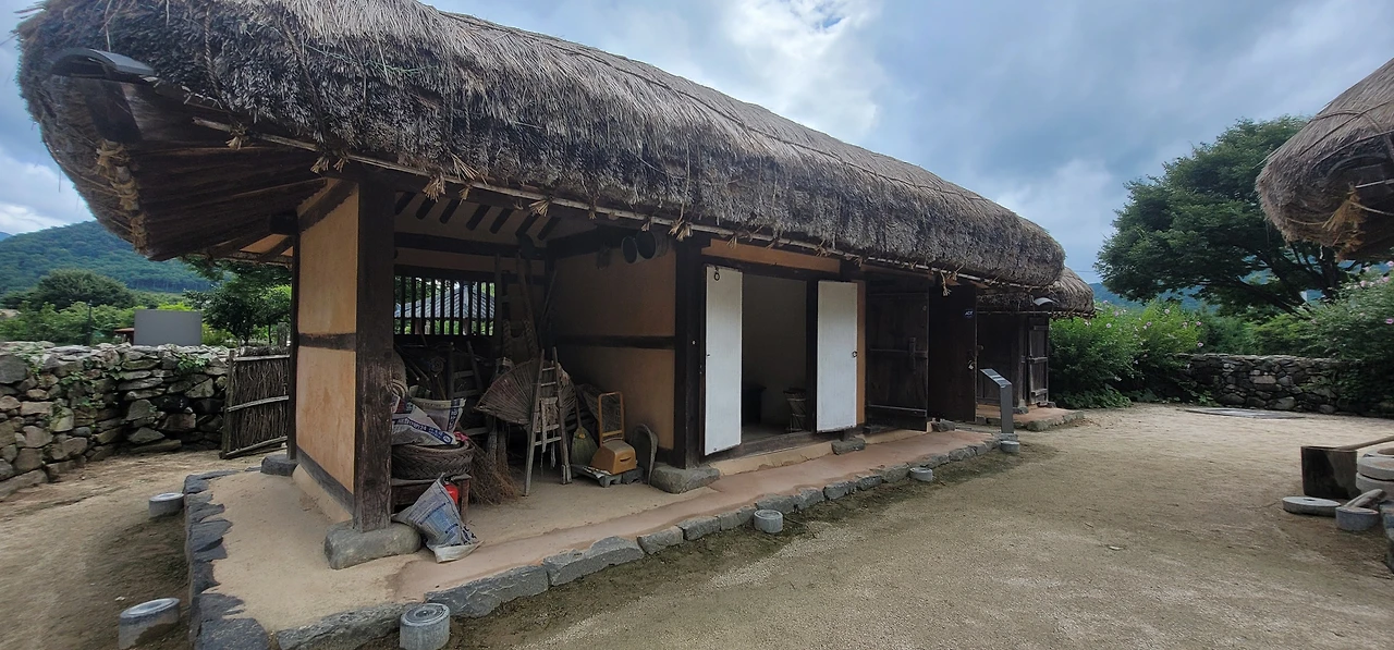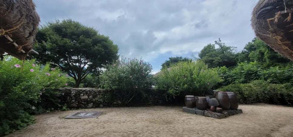 장독대 위 항아리들도 찌는듯한 무더위를 잘 견디고 있고, 저장창고로 보이는 볏짚으로 만든 움집도 있다.