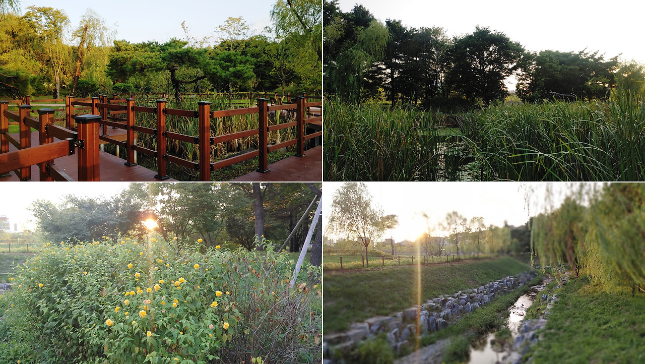 400번 버스에서 내린 우리는 '놀이 정원' 입구로 들어와 생태연못과 생태계류 쪽부터 둘러보았다. 금요일 오후 6시를 막 넘긴 시간, 천안삼거리 공원 푸른 잔디 위로는 아직도 긴 여름 해살이 눈부시게 빛났다.