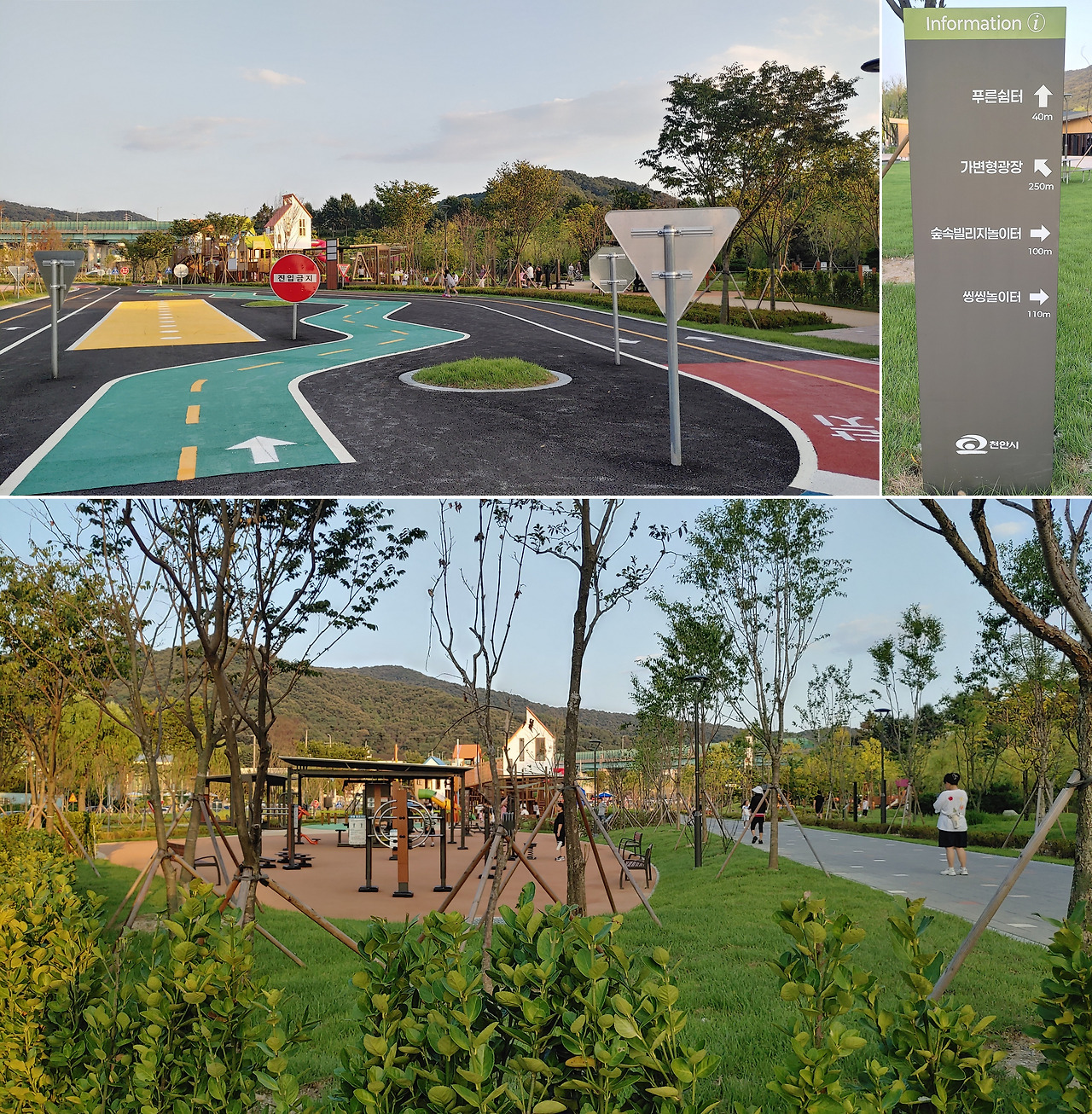 400번 시내버스를 타고 천안삼거리 정류장에 내리면, 바로 앞에 천안삼거리 공원으로 들어설 수 있다. 오른쪽으로 '푸른 쉼터'가 보이고, 왼쪽으로 '숲 속 빌리지 놀이터'와 '씽씽 놀이터'가 보인다. 녹색정원과 놀이 정원 사잇길로 들어선 것이다.