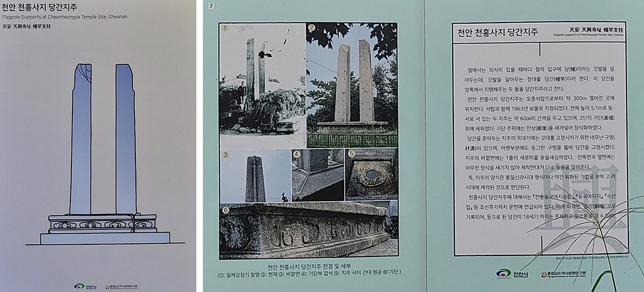 고려 태조 4년(921)에 창건되었던 천흥사의 당간지주로 현재 천안시 천흥리 마을의 가운데에 자리 잡고 있다. 절에서는 의식이 있을 때, 절의 입구에 당(幢)이라는 깃발을 달아두는데, 깃발을 달아두는 장대를 당간(幢竿)이라 하며, 이 당간을 양쪽에서 지탱해 주는 두 돌기둥을 당간지주라고 한다.