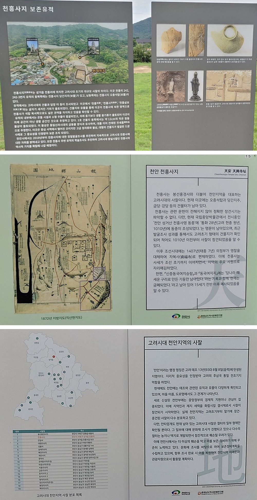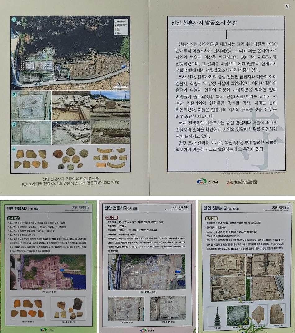 마을 초입 왼쪽 공터에서 몇 발자국 더 걸어가면, 오른쪽으로도 '매장 유산 보호 및 조사에 관한 법률'로 지정된 넓은 빈터가 또 보였다. 얼마나 많은 문화재가 발굴을 기다리고 있을지도 궁금했고, 그 귀중한 유산들과 어서 만나보고 싶기도 했다. 유물 매장지로 지정된 공터 뒤로, 천안 천흥사지 오층석탑과 천흥사라는 절집이 보였다. 오층석탑으로 가는 길옆, 발굴지에 쳐져 있는 펜스에는 천한 천흥사지 발굴과정과 현황 및 계획들이 사진과 함께 상세하게 기록으로 남아 있었다. 우리는 자연스레 걸음을 멈추고 그 내용들을 꼼꼼하게 읽어 보았다. 이런 공간을 마련한 천안시의 친절한 배려가, 지나치는 사람들에게 우리 문화재를 향한 작은 관심을 불러일으키리라는 생각이 들었다.