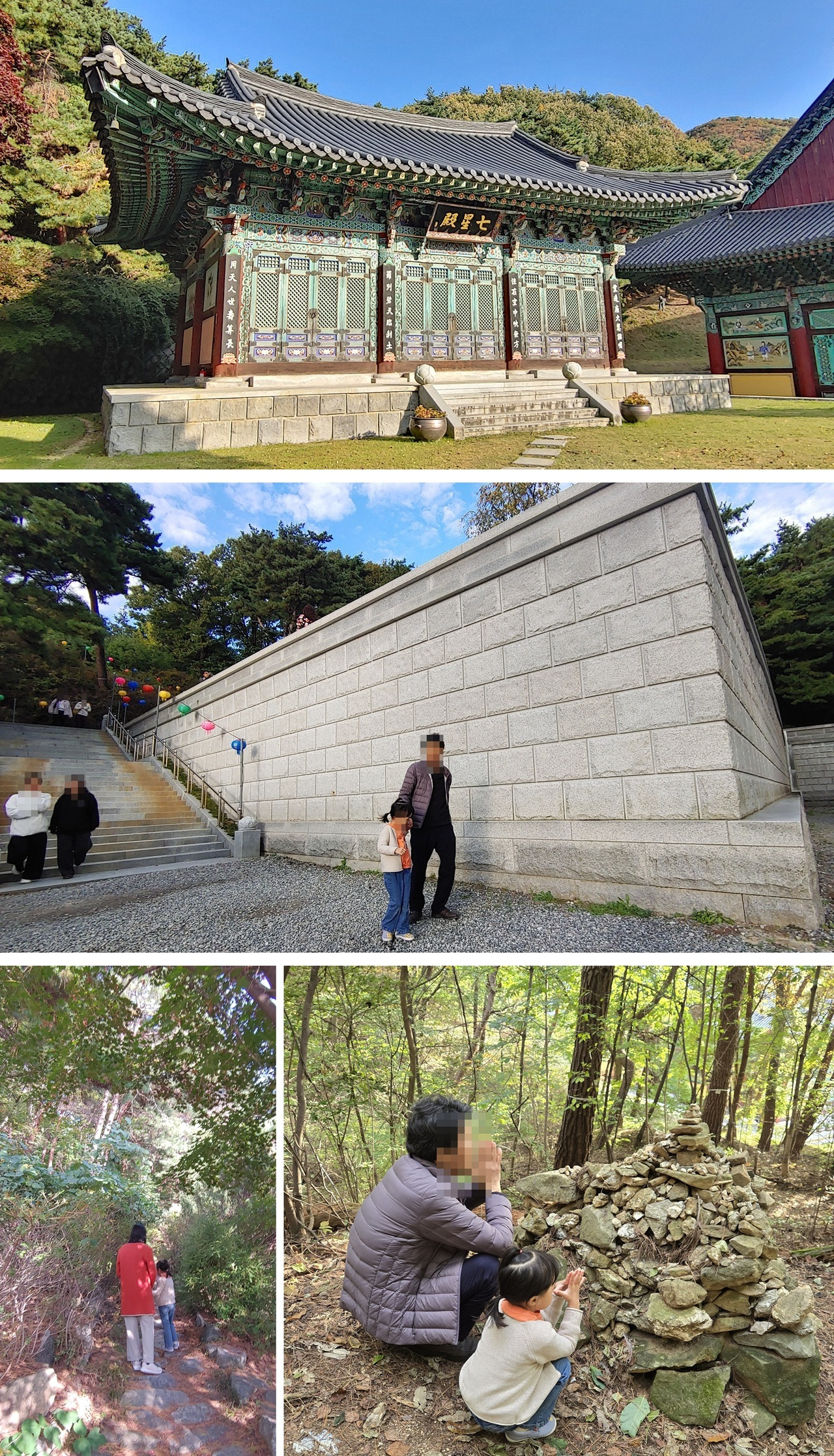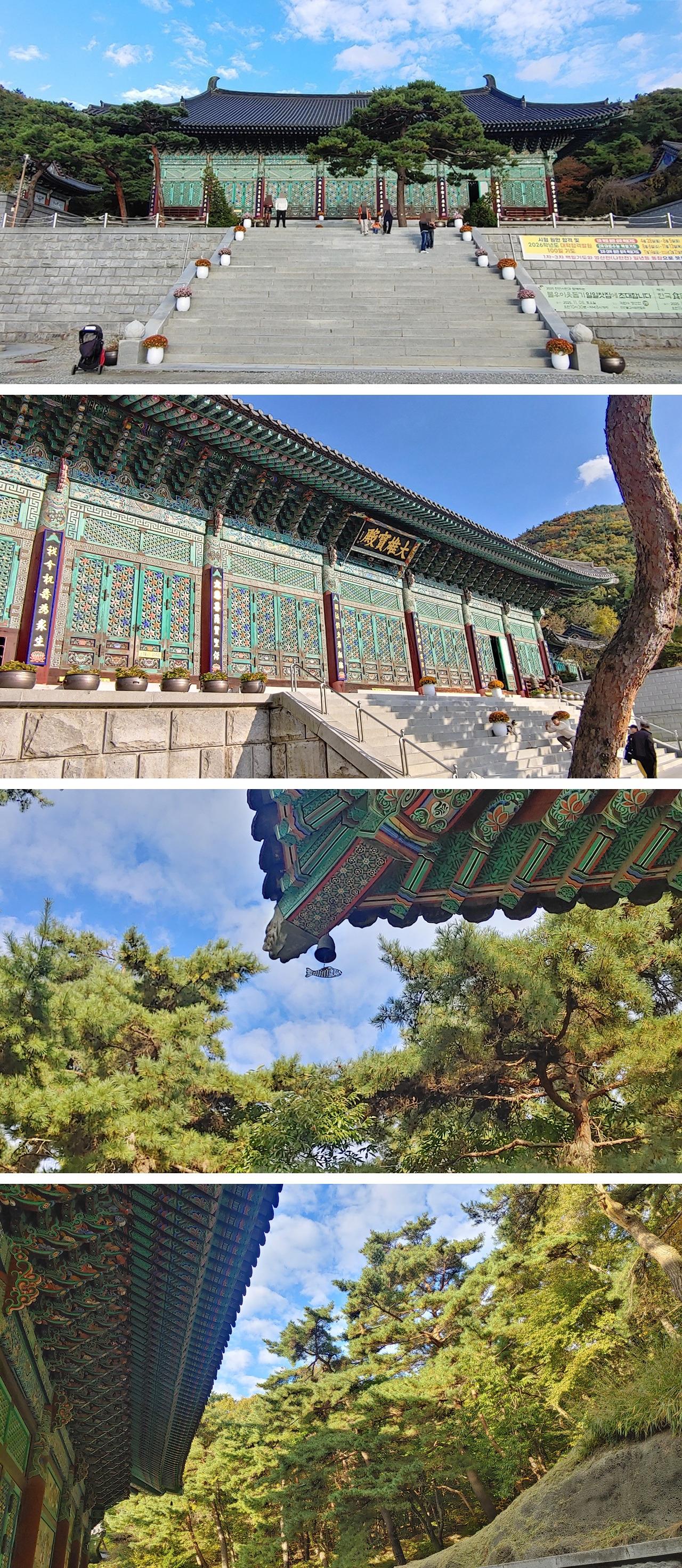 칠성전은 대웅보존 왼쪽에 있다. 다시 웅장한 대웅보존 앞을 지나 칠성전으로 가는 길, 대웅보존 처마 사이로 청동대불의 뒷모습이 가을 풍경과 함께 보인다. 봄엔 겹벚꽃으로 장관을 이루던 곳이 이제는 가을빛 단풍옷으로 곱게 갈아입었다.