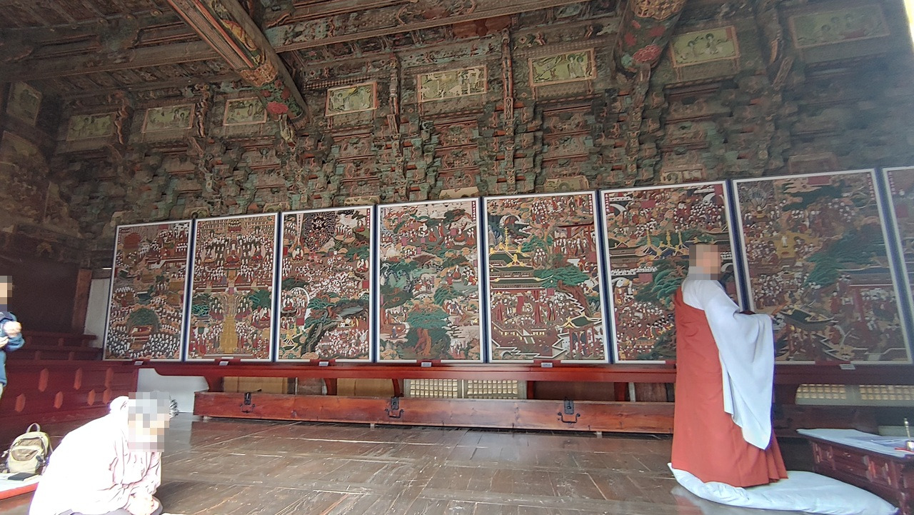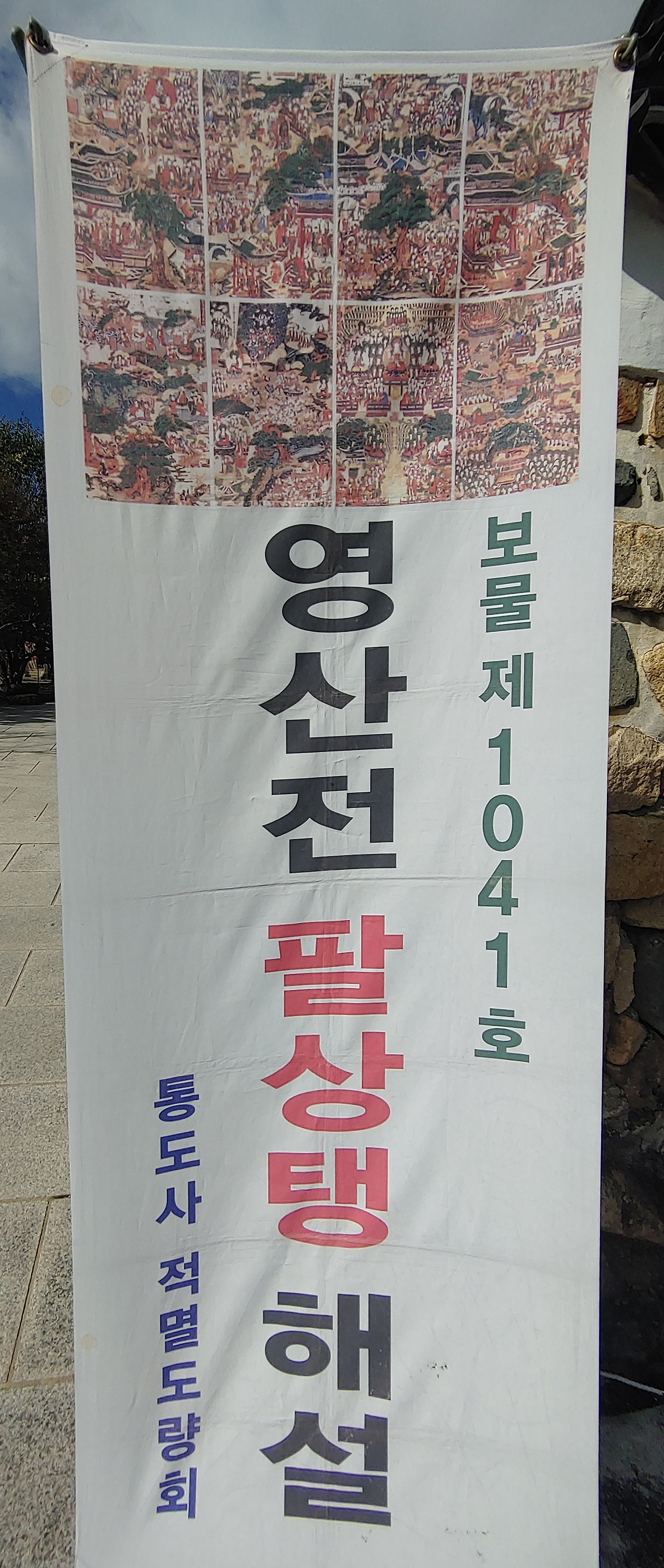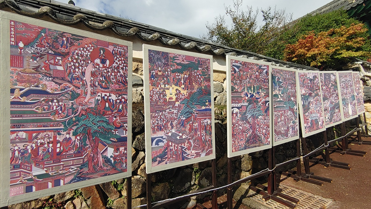 '영산전 팔상탱' 작품 8점이 천왕문으로 오른쪽에 위치한 '은당' 담벼락에서 전시 중이었다.