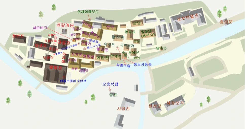 가람의 배치는 법당을 중심으로 세 지역으로 나누어 상로전·중로전·하로전이라 부르고 있다.