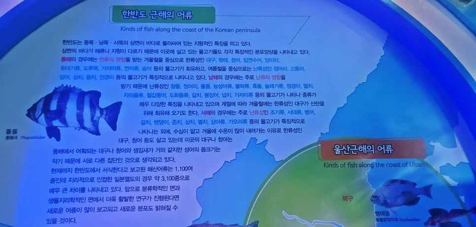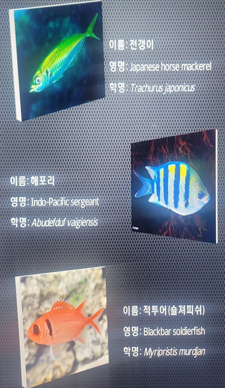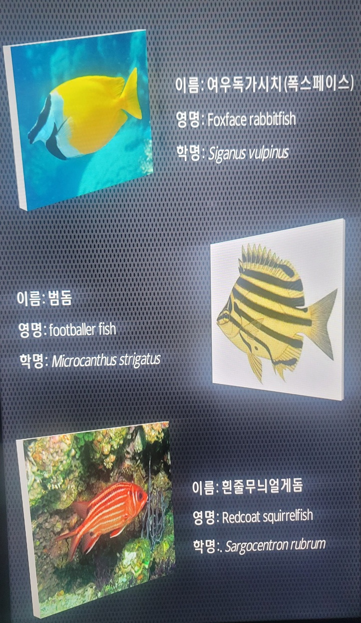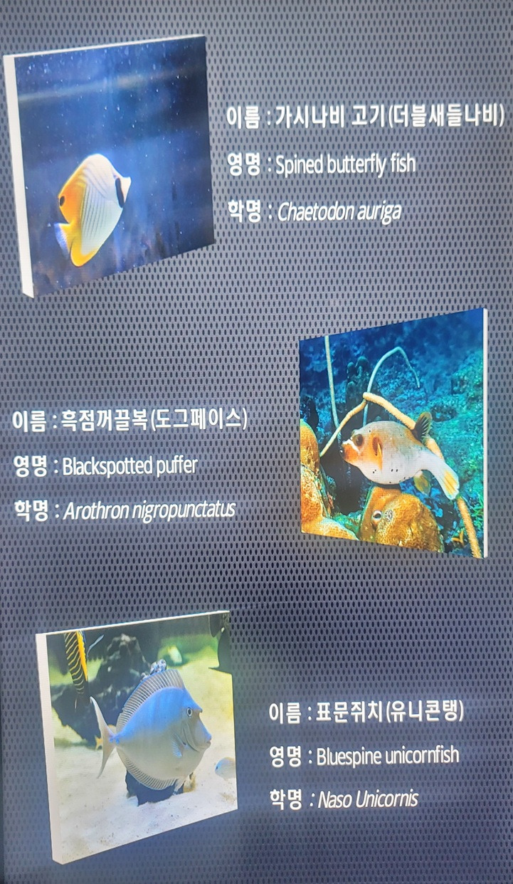 어류 수족관에서는 알록달록 형형색색의 다양한 열대어들과 생전 처음 보는 신기한 어종들이 살고 있다. 각 수조마다 어떤 종류의 물고기들인지 상세한 설명과 사진이 곁들여져 있어 나 같은 문외한이 관람하는데도 큰 도움이 된다.