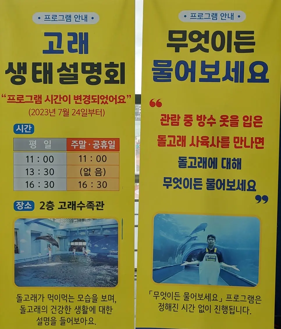 고래생태 설명회는 평일 오전 11시, 오후 1시 30분, 4시 30분 세 차례 진행되며, 주말에는 두 차례 진행된다. 설명회는 돌고래쇼가 아닌, 돌고래 생활에 대한 해설과 안내라고 한다. 먹이를 먹는 돌고래 모습도 볼 수 있어 어린이들에 인기가 있다.