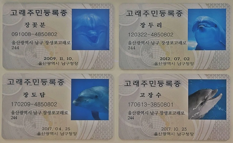 대형 수족관에는 네 마리의 돌고래가 함께 살고 있다. 이들은 울산시 주민증까지 발급받은 시민이다. 폰으로 찍은 주민증과 유영하는 고래들을 번갈아 바라보며 그 이름을 맞혀보고 싶었지만, 잘생긴 고래 네 마리가 어찌나 똑같아 보이던지 그냥, 가족이니 닮았거니 하고 포기했다. 돌고래 수명은 종에 따라 다르며, 야생에서는 대체로 30~50년으로 알려져 있다.