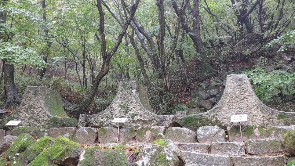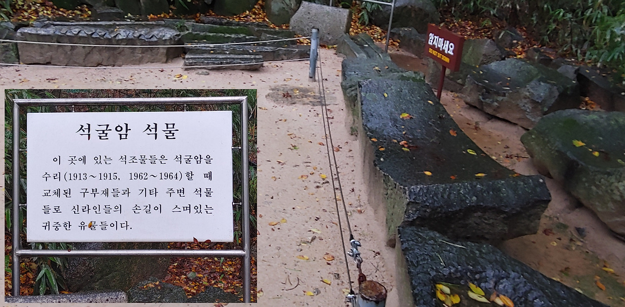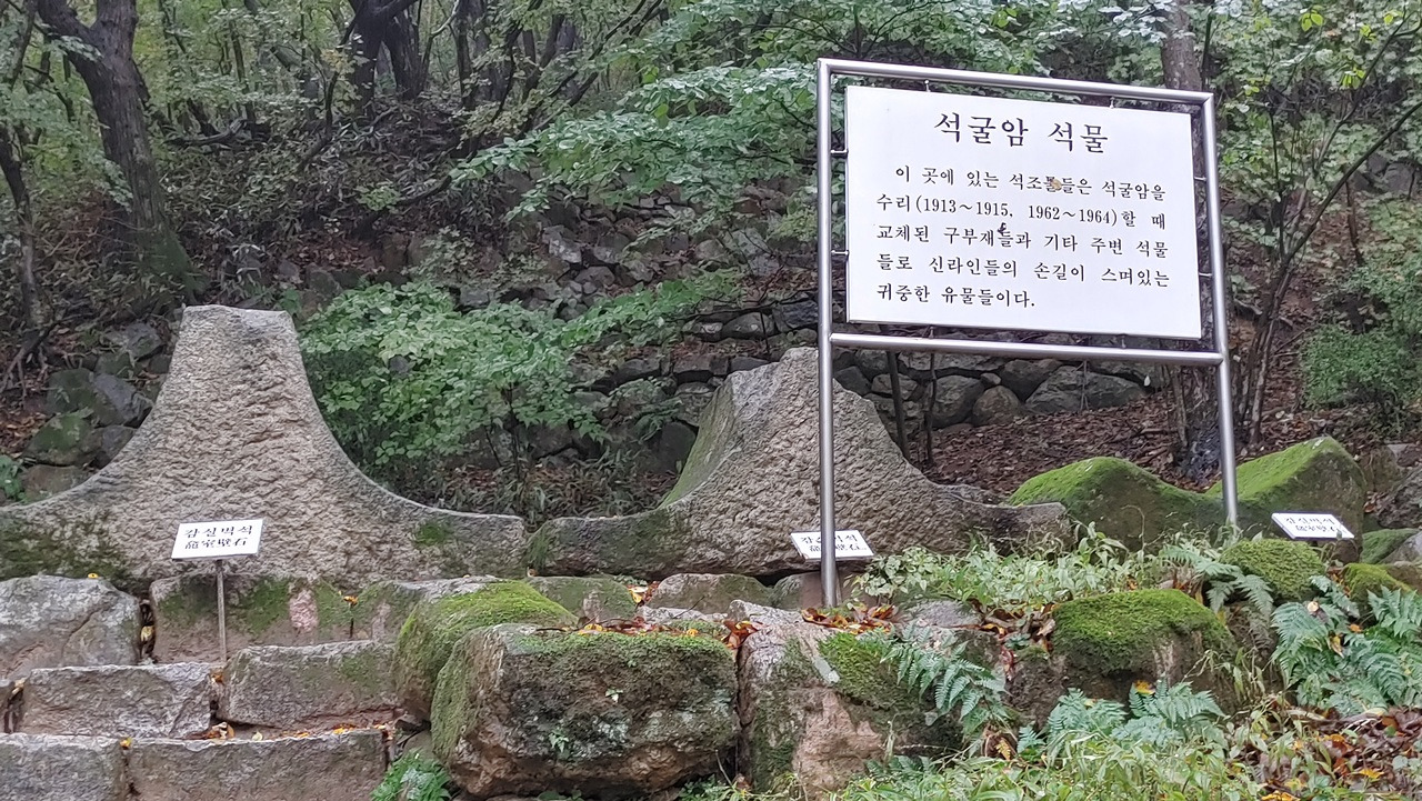 석굴암을 향해 돌계단을 오르면, 석굴암 왼쪽으로 석물들이 늘어서 있다.