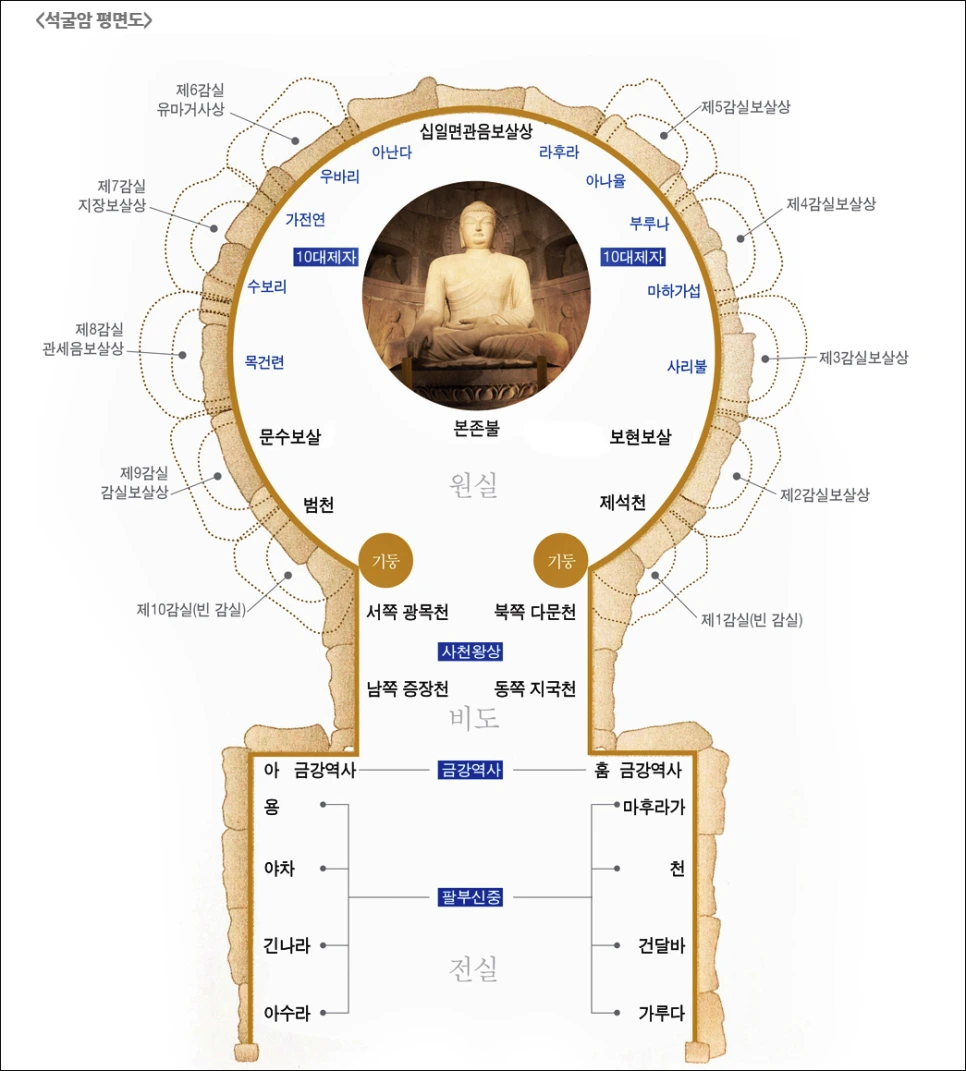 원형 주실 입구에는 좌우 8각 돌기둥을 세웠고, 주실 안에는 본존불이 중심에서 약간 뒤쪽에 안치되어 있다. 주실 벽면에는 입구에서부터 천부상 2구, 보살상 2구, 나한상 10구가 채워졌다. 본존불 뒷면 둥근 벽에는 석굴 안에서 가장 정교하게 조각된 십일면관음보살상(보살의 머리에 11면의 얼굴을 가지고 있는 관음보살상)이 있다. 원숙한 조각 기법과 사실적인 표현으로 완벽하게 형상화된 본존불, 얼굴과 온몸이 화려하게 조각된 십일면관음보살상, 용맹스러운 인왕상, 위엄 있는 모습의 사천왕상, 유연하고 우아한 모습의 각종 보살상, 저마다 개성 있는 표현을 하고 있는 나한상 등 이곳에 만들어진 모든 조각품들은 동아시아 불교조각의 걸작품이다. 특히, 주실 안에 모신 본존불의 고요한 모습은 석굴 전체에서 풍기는 은밀한 분위기로 그 신비로움을 더해준다. 자연스러운 모습의 본존불은 깊고 숭고한 마음을 간직한 가장 이상적인 모습이며, 모든 중생들에게 자비로움을 전하고 있었다.