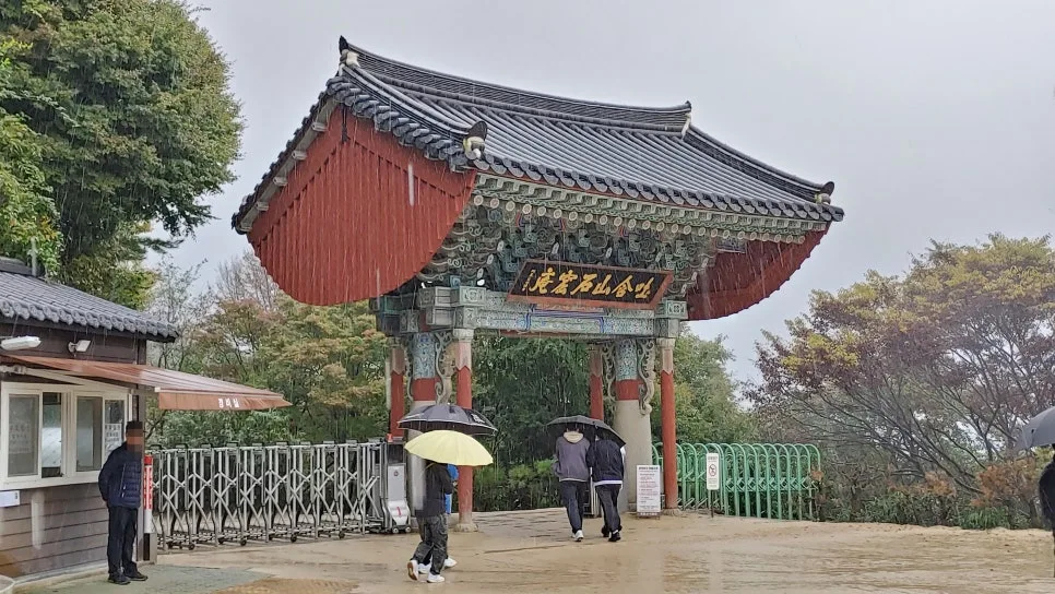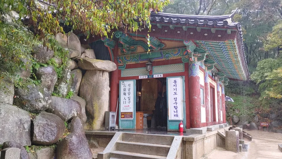 사람들은 가을비를 피하기 위해 각자 단단히 중무장을 하고 석굴암 통일 대종 오른쪽에 있는 돌계단을 올라갔다.